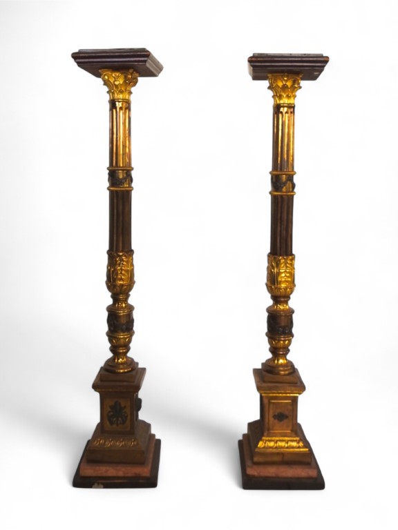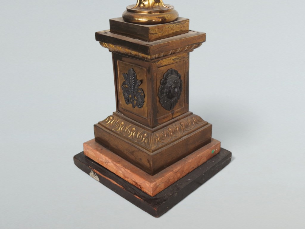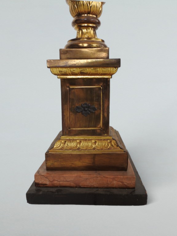 Lot 137 | Coppia di grandi portavaso in legno rivestiti in ottone dorato con base a plinto su piano in marmo rosso di Verona