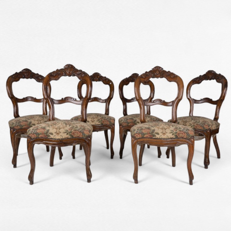 spalliera sagomata e decorata da motivi fitomorfi, sedile rivestito in cotone operato a fiori, gambe sinuose