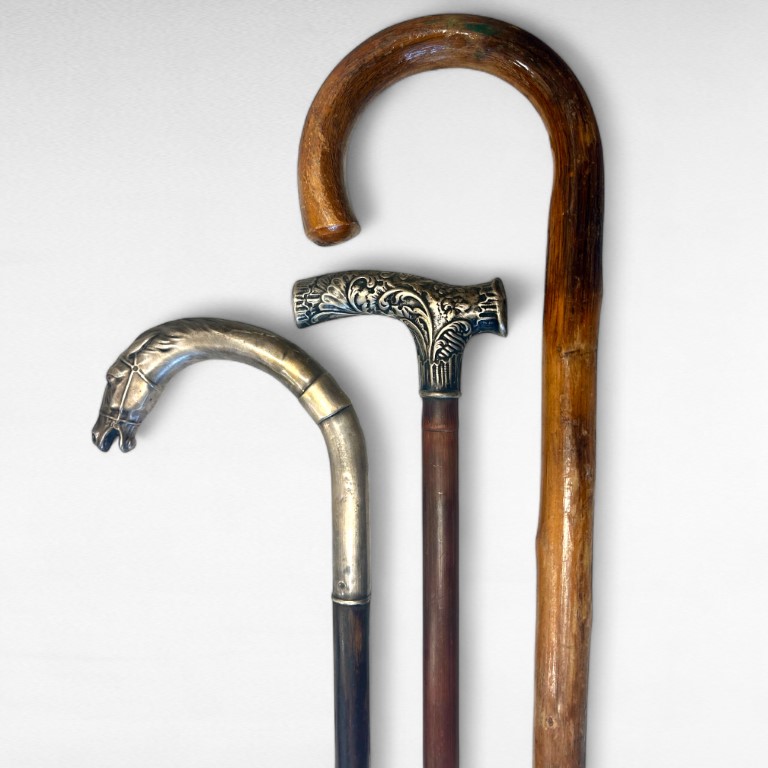 uno con manico in argento a forma di testa di cavallo, uno con manico in argento a racemi vegetali, l'altro in canna.
