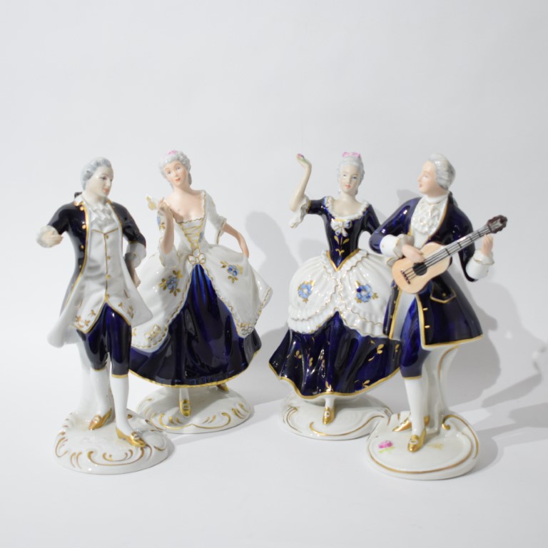 Quattro grandi statuette di danzatori in abiti del Settecento in porcellana policroma, Manifattura Royal Dux