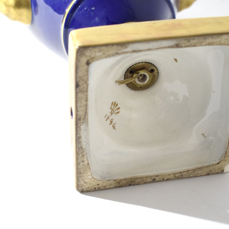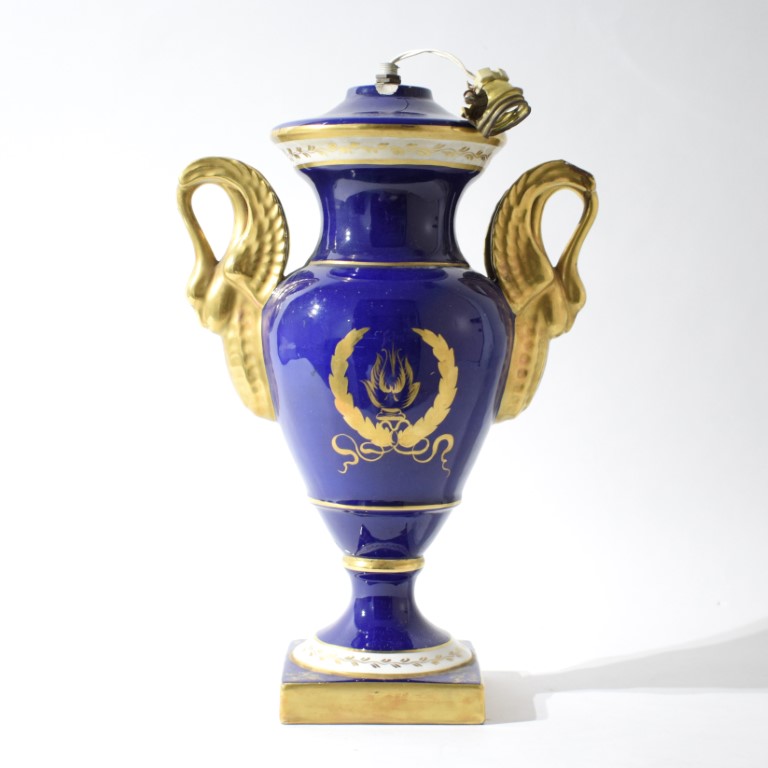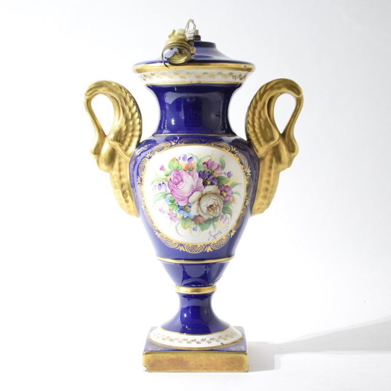 Con anse a cigno stilizzato, dipinto con composizione floreale, montato lume