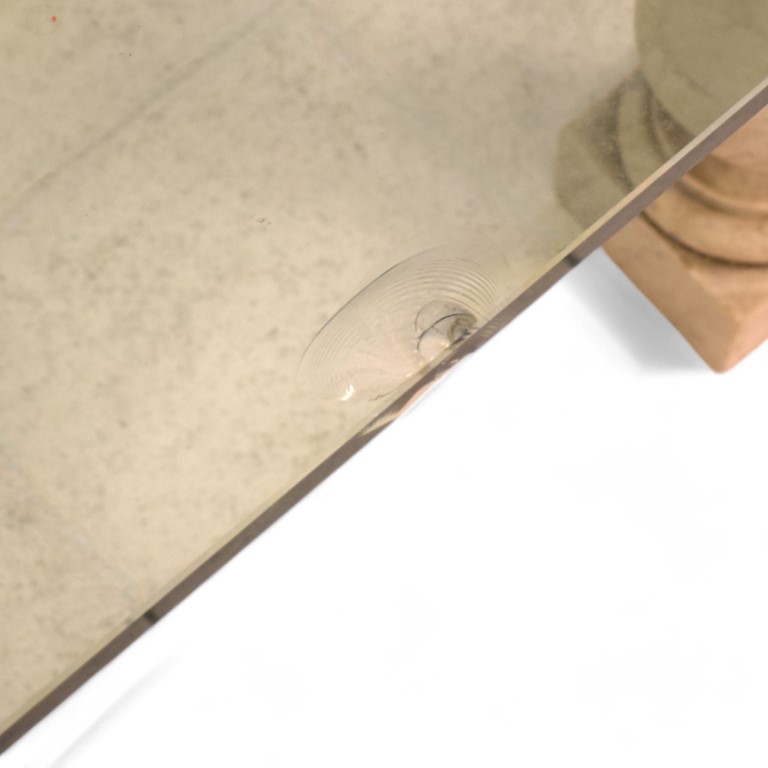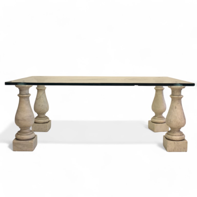 Con quattro sostegni a balaustro in marmo bianco e piano in cristallo danneggiato