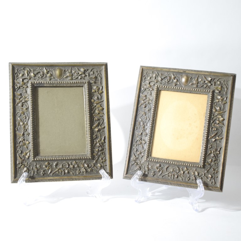 Coppia di cornici rettangolari in metallo argentato e sbalzato a tralci d'edera