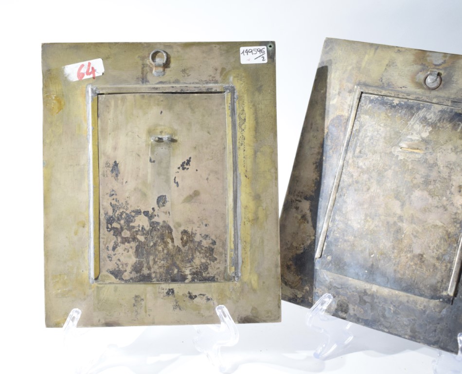 Coppia di cornici rettangolari in metallo argentato e sbalzato a tralci...