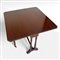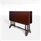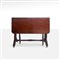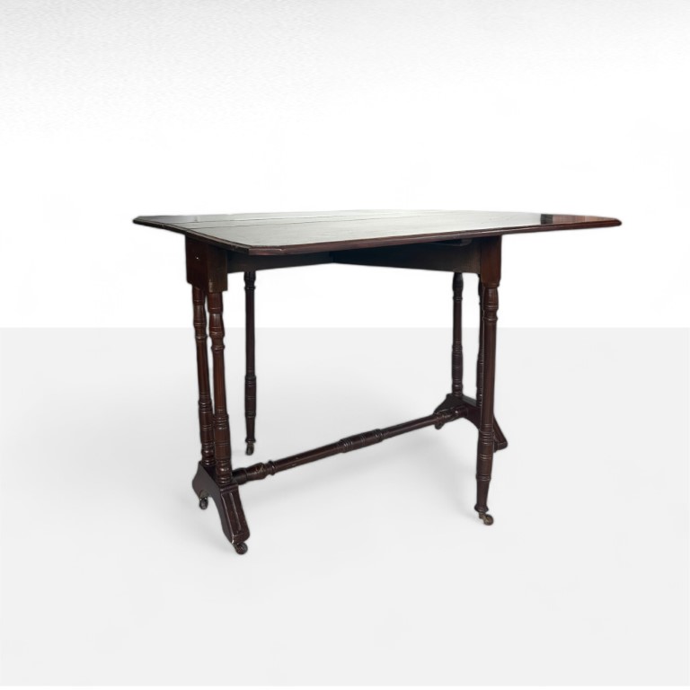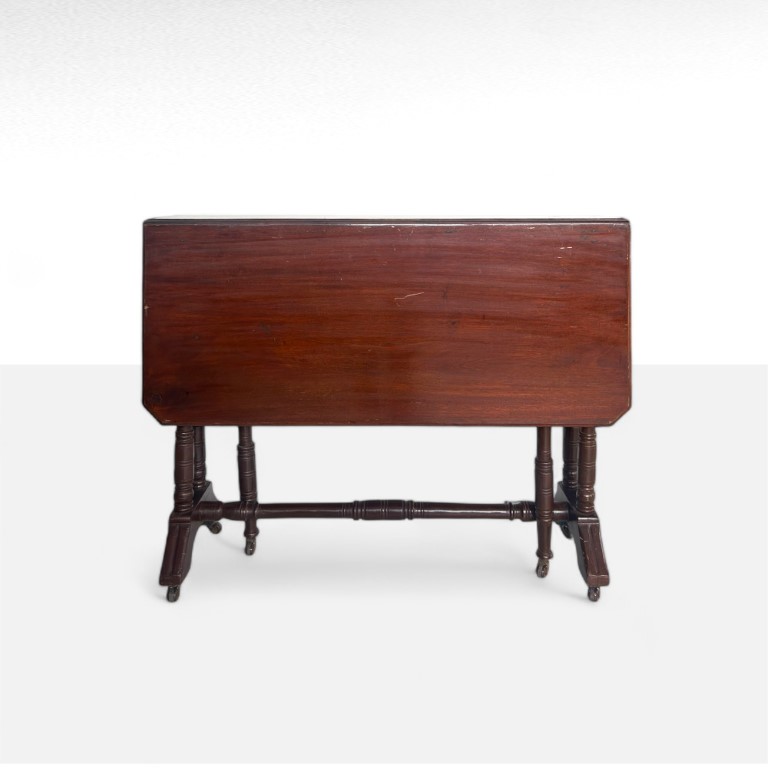 piano rettangolare con angoli smussati, gambe tornite a rocchetto, riunite da traversa ugualmente tornita, piedi su rotelle
