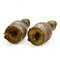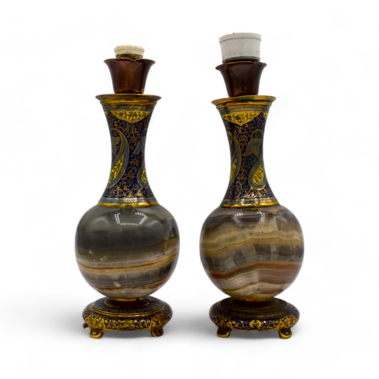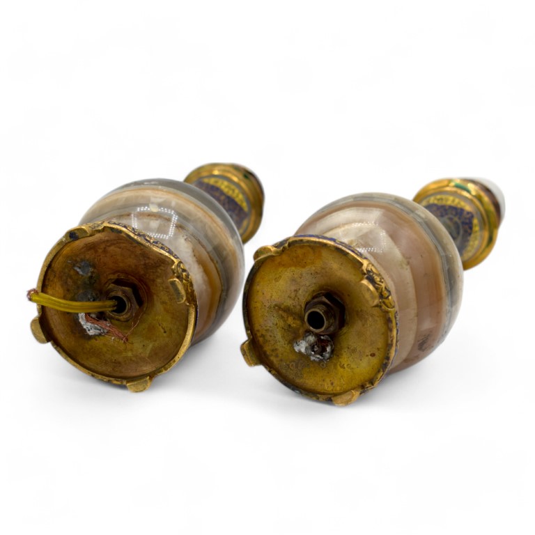 Coppia di piccoli lumi da comodino in onice, bronzo e smalti