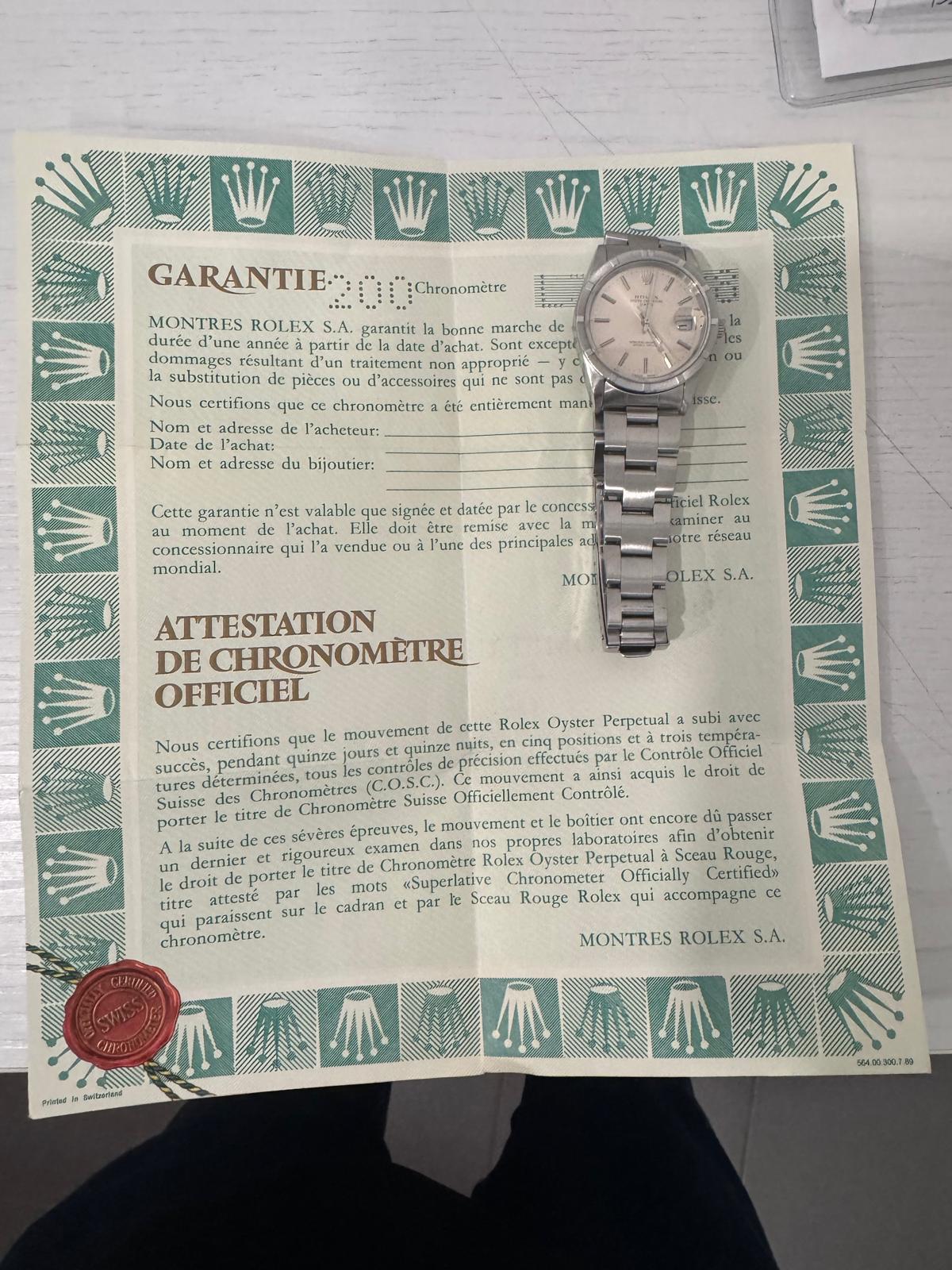 BRAND ROLEX MODEL (WATCH) OYSTER PERPETUAL DATE REFERENCE NUMBER 15210 MOVEMENT AUTOMATIC CASE MATERIAL STEEL STRAP MATERIAL STEEL YEAR OF PRODUCTION 1988 ORIGINAL PAPERS, NO BOX MOVEMENT AUTOMATIC CASE CASE MATERIAL STEEL DIAMETER 34 MM BEZEL MATERIAL STEEL GLASS SAPPHIRE CRYSTAL STRAP MATERIAL STEEL CLASP DÉPLOYANTE CLASP MATERIAL STEEL - AUCTION COMMISSION 25%