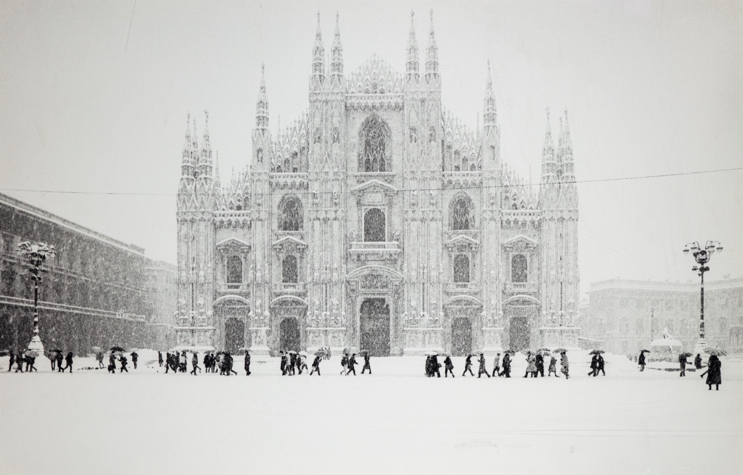Se oggi il Naviglio è il teatro della movida, negli anni ’60 manteneva il ricordo di una antica Milano attraversata da vie d’acqua. Sempre lontano dalle trappole della nostalgia (perché i bei tempi andati non erano poi tanto belli), Virgilio Carnisio si sofferma sulla semplice armonia della facciata di una casa che si riflette sulla superficie del canale ma sa sorprendere con la figura della donna che lava i panni appoggiata a una lastra di pietra, in milanese “brellin”. Lo sguardo si concentra su di lei, su quei gesti antichi che ancora sopravvivono e profumano di realtà. Il 13 gennaio 1985 era domenica, a San Siro il Milan giocava con il Como e gli spettatori finirono per distrarsi (non gli ospiti che vinsero 2 a 0) perché la neve imbiancava il campo e avrebbe continuato a scendere per quattro giorni coprendo l’intera città. Per un fotografo come Carnisio si spalancarono mille possibilità di cogliere immagini spettacolari come questa che riprende da lontano il passaggio dei pedoni che attraversavano Piazza del Duomo sul sentiero tracciato nella neve. La fotografia, che allude sia al nuovo paesaggio sia all’operosità di una città mai ferma, divenne la copertina del volume Sotto la neve di Milano che Carnisio pubblicò nei mesi successivi.