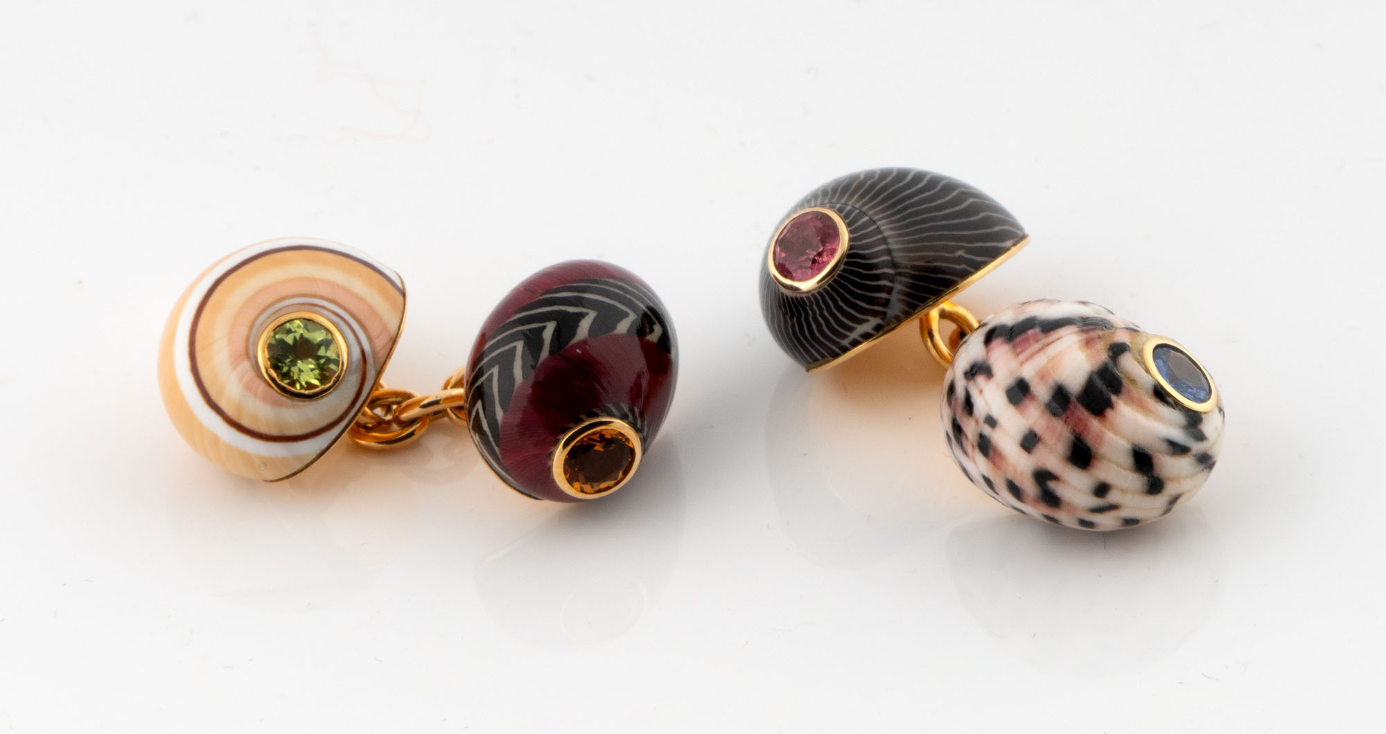 Trianon, USA, Gemelli in oro 18kt con conchiglie e pietre. 1990 ca. Gemelli in oro 18 kt con cocnhiglie e pietre (ametista, zaffiro, citrino). cm 3. gr. 9. (2)
