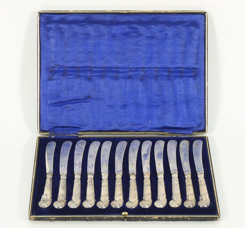 SERIE DI DODICI COLTELLINI DA BURRO Città di Sheffield, 1910 manici rivestiti in argento sbalzato con motivi floreali, entro custodia in cuoio nero A SET OF TWELVE BUTTER KNIVES, SHEFFIELD, 1910