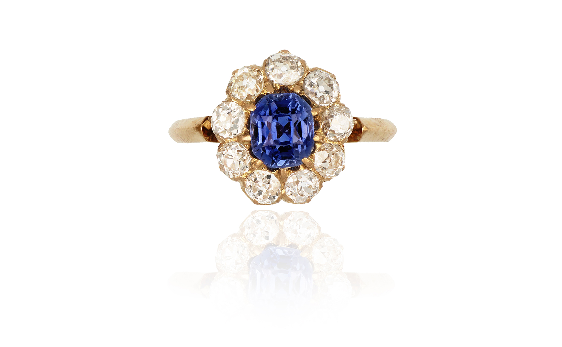 Anello in oro rosa di antica manifattura la forma a margherita è realizzata con diamanti taglio antico per ct. 1 00 ca. e uno zaffiro ceylon non riscaldato di ct. 1 00 ca.