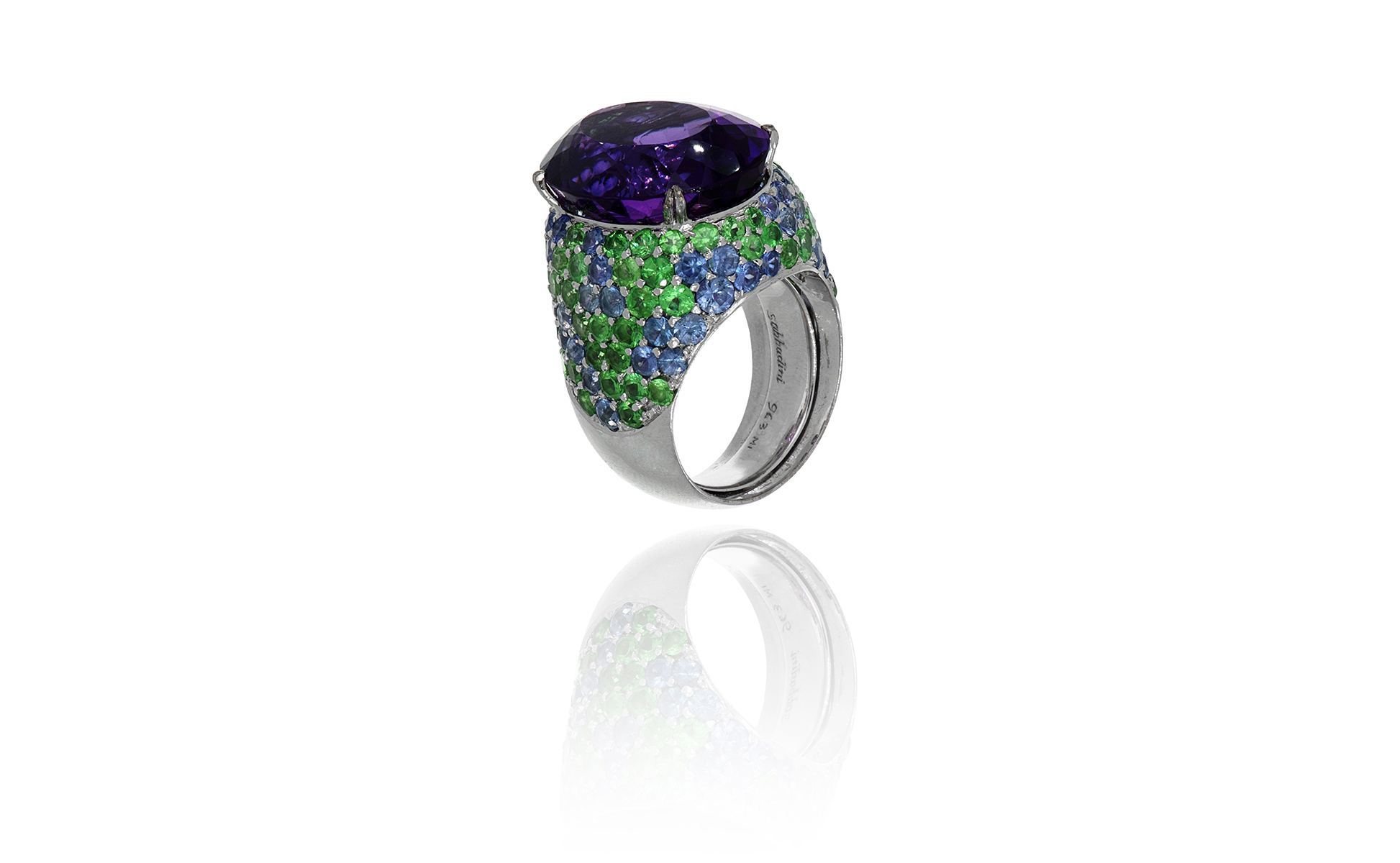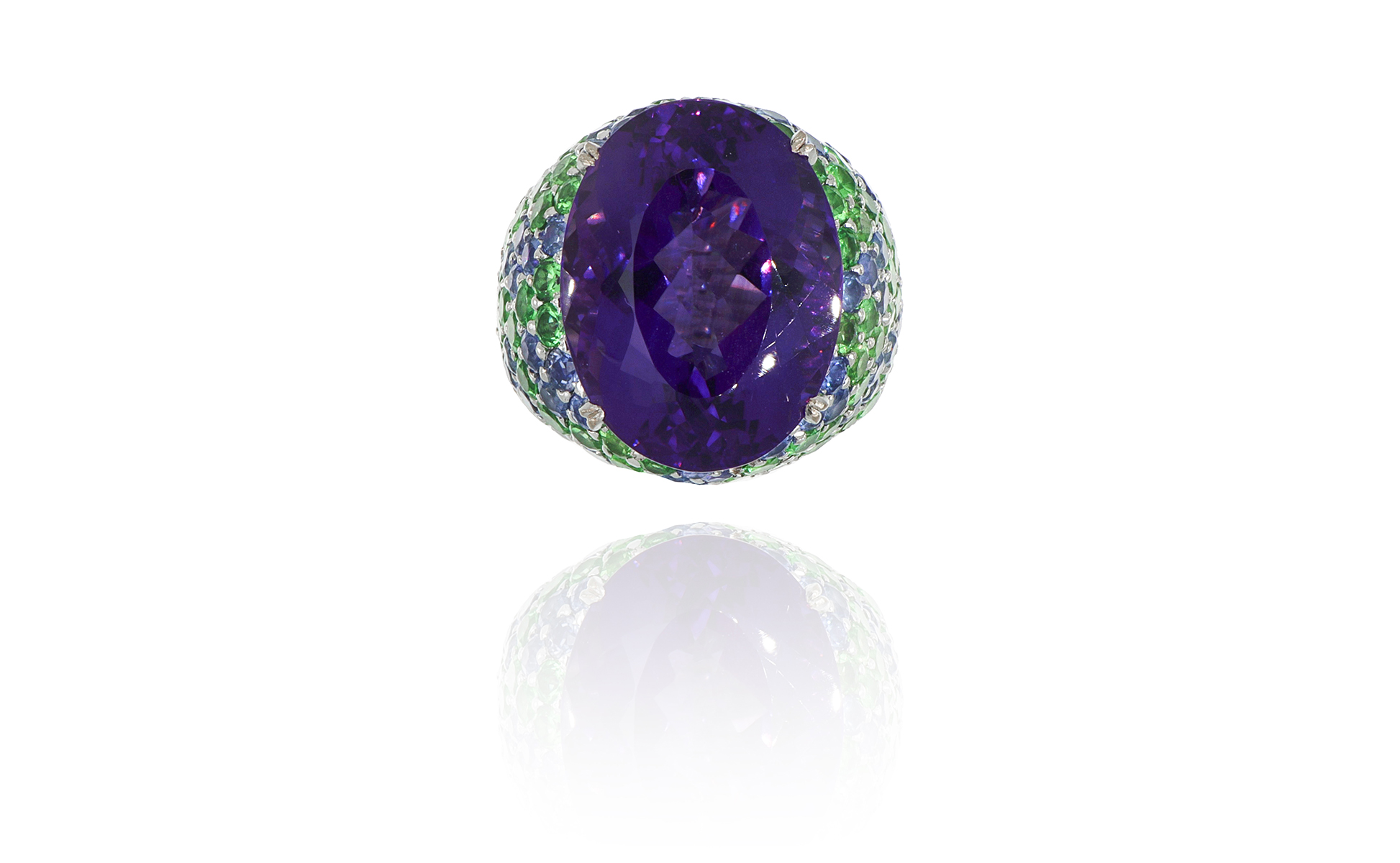 SABBADINI grande anello a fascia in oro bianco con ametista taglio ovale e pietre semipreziose a pave' su tutto il gioiello.