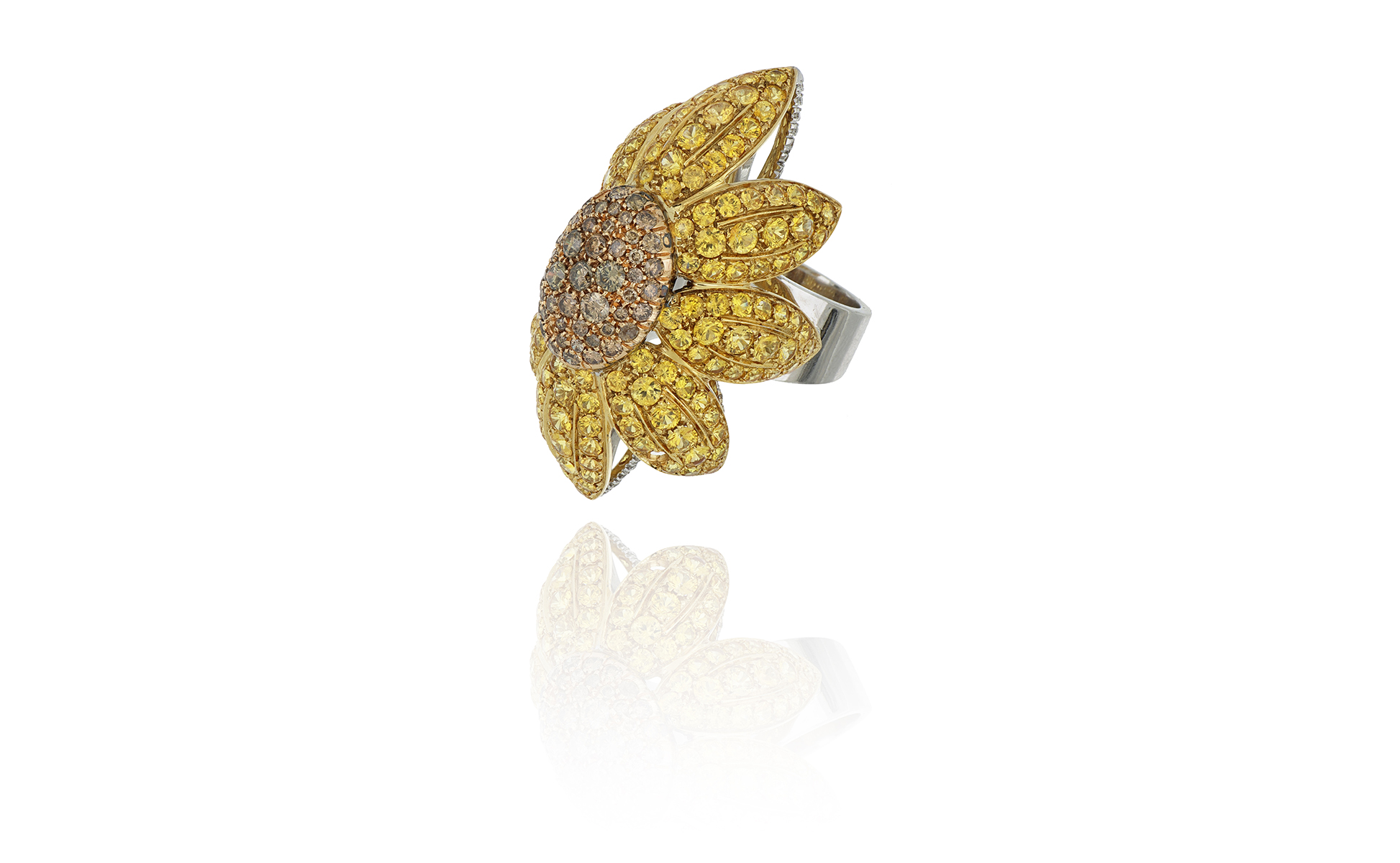 Enorme anello a girasole realizzato in oro bianco stilizza la corolla adagiata al dito del grande fiore la gioiosa composizione è realizzata con zaffiri gialli sui petali per ct. 16 0 ca. e diamanti fancy brown al centro piccoli altri incolori nella bordatura.