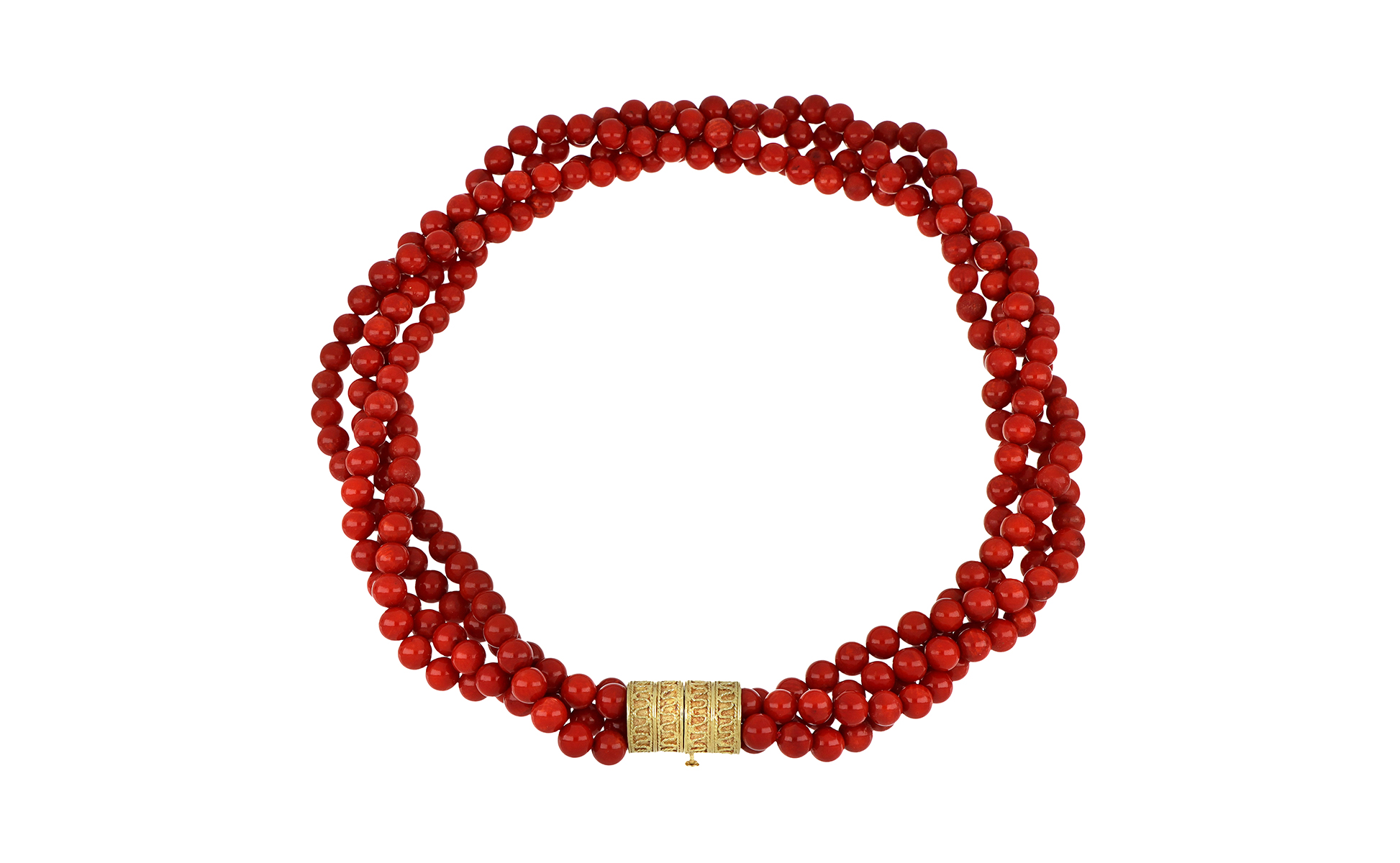 Girocollo in corallo rosso di ottima qualità a 4 fili sfere di diametro 7 mm chiusura a bariletto in oro giallo con lavorazione tipo 'Sforza'.