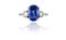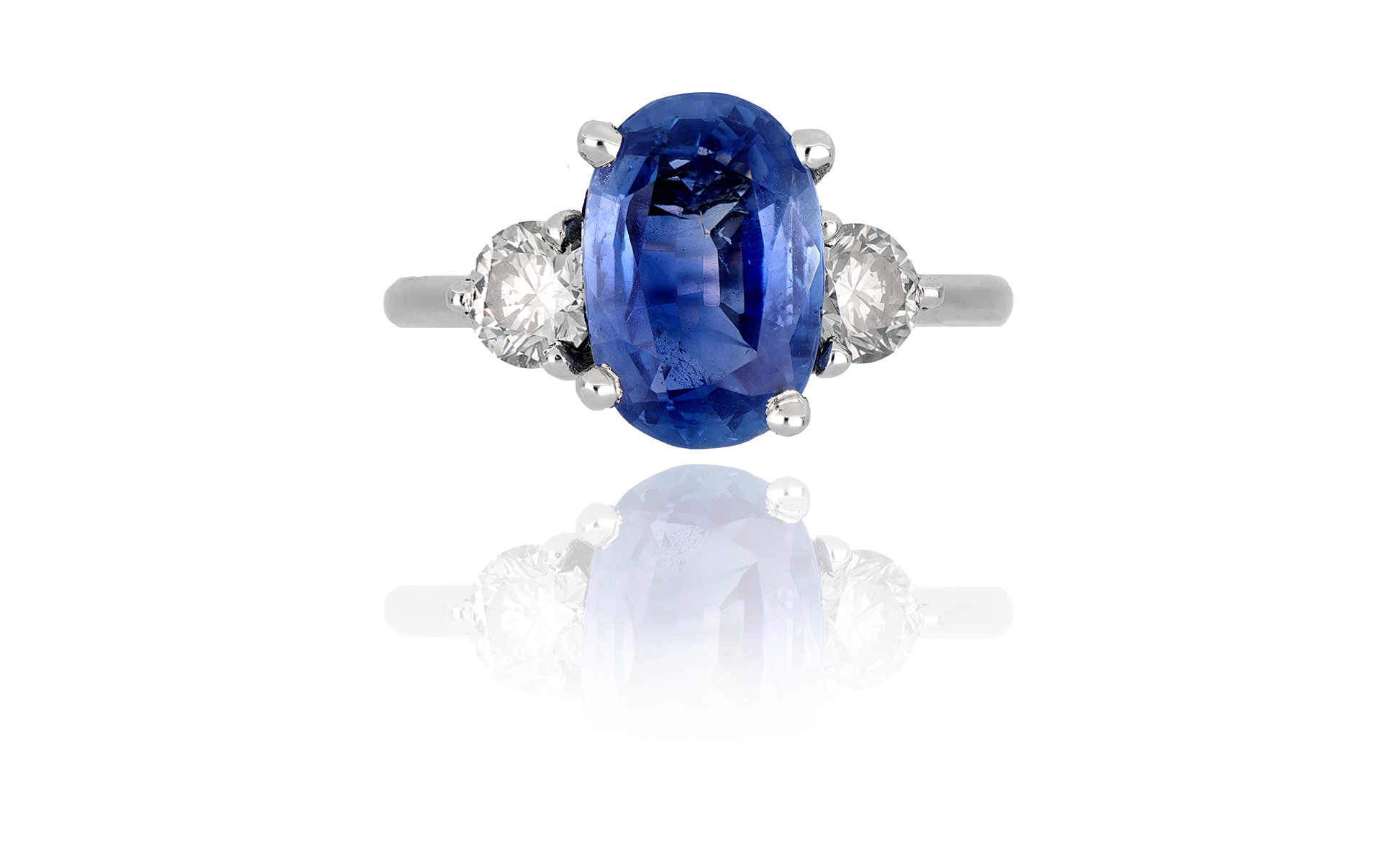 Anello in oro bianco a tre pietre con zaffiro centrale di forma ovale di 5 01 ct accompagnato da report gemmologico IGI Antwerp che lo attesta di origine Ceylon con trattamento termico. Lateralmente due diamanti di forma rotonda taglio a brillante per totale 1 05 ct.