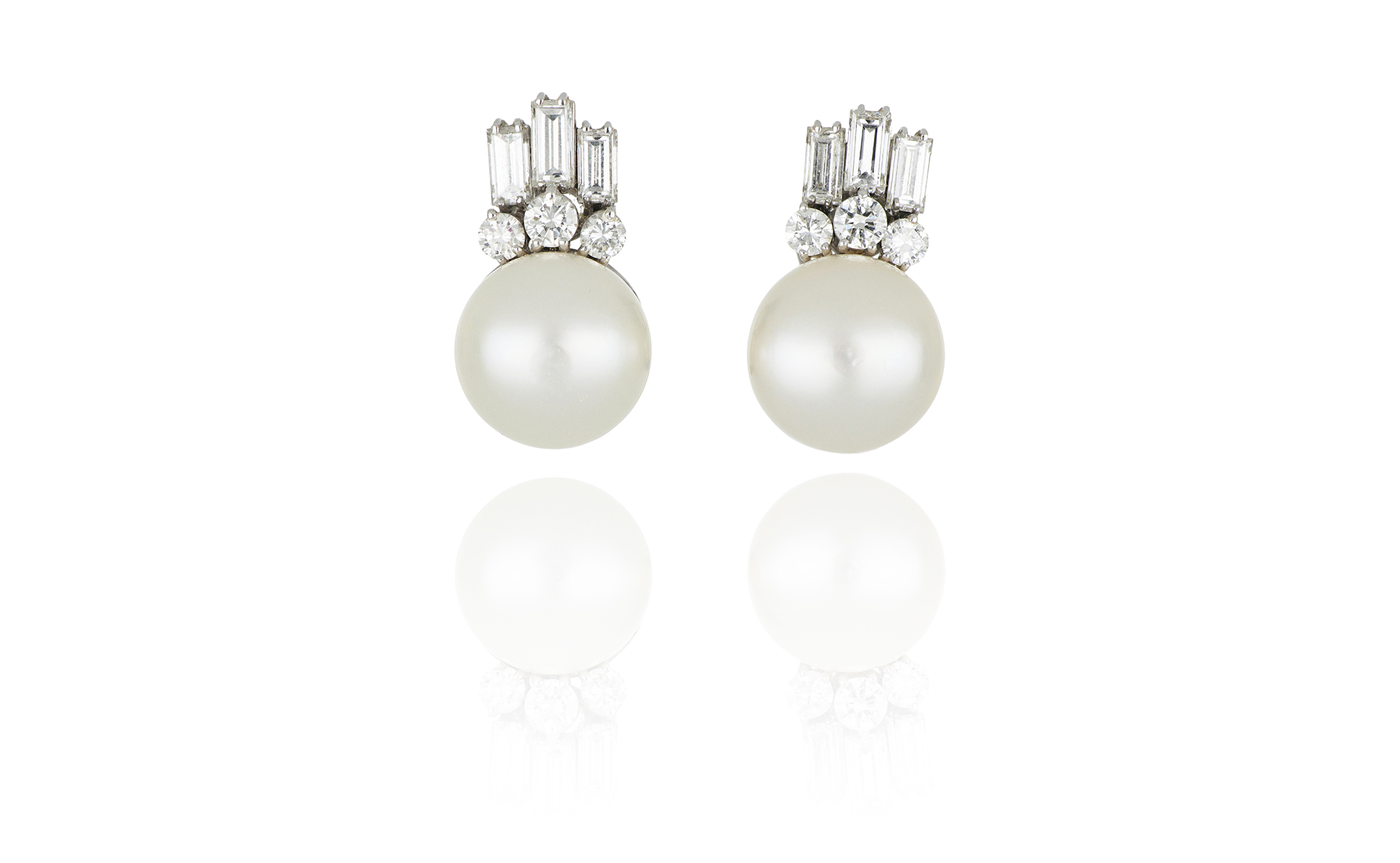 Classici orecchini con perla e diamanti realizzati in oro bianco una grande perla australiana di 13 5 mm è sormontata da 3 diamanti taglio brillante e 3 taglio baguette per complessivi ct. 2 10 ca.