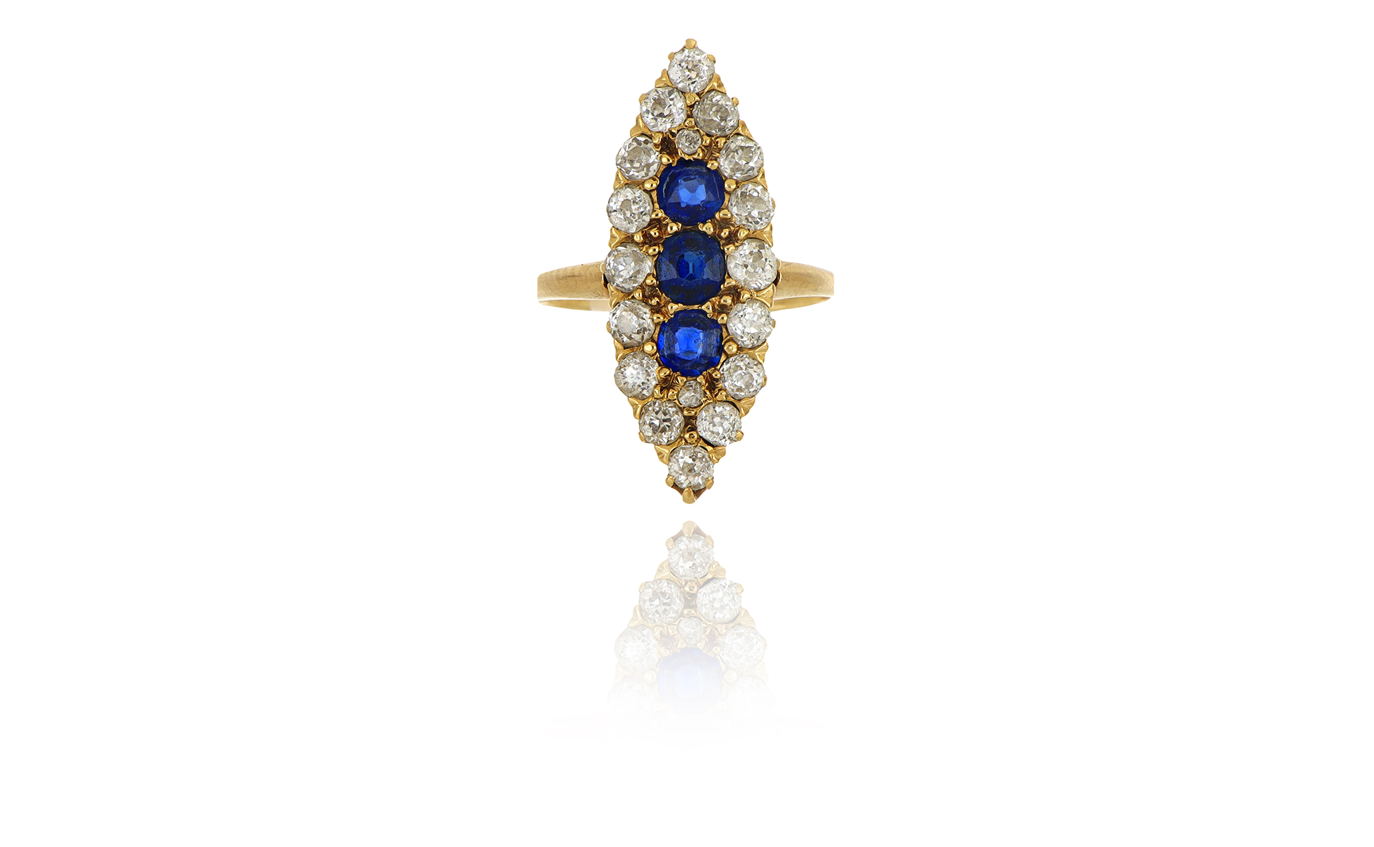 Anello in oro giallo a figaro con diamanti di taglio antico per ct. 1 10 ca. e 3 zaffiri blu centrali per ct. 0 60 ca. in linea.