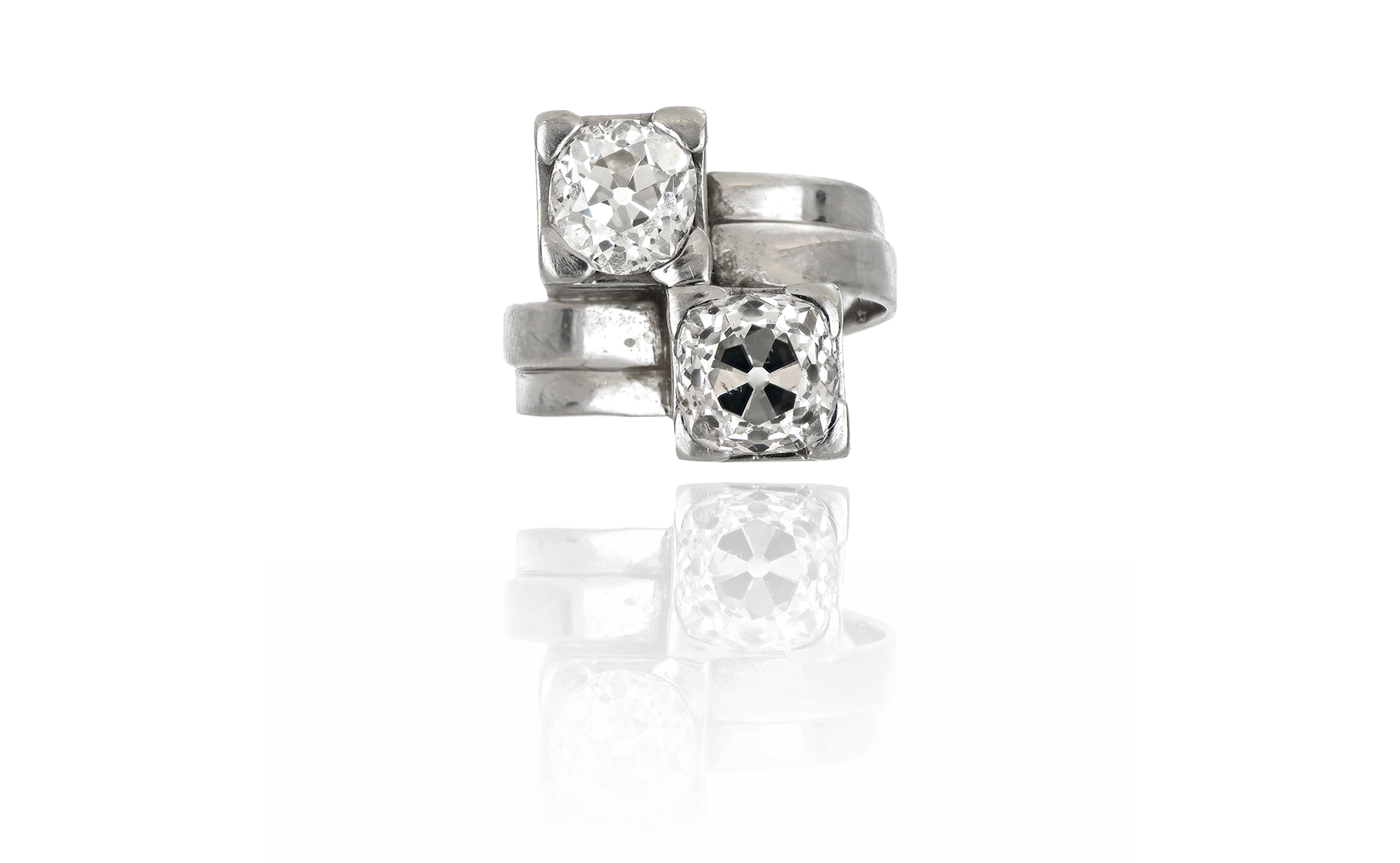 Anello a contrarie' in oro bianco due diamanti taglio antico si contrappongono uno all'altro in questa montatura squadrata.