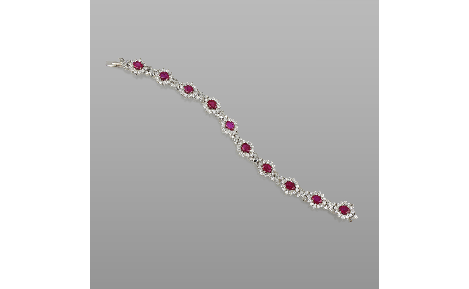 Bracciale a margherite finemente realizzato in oro bianco 10 settori ovali si rincorrono snodati al centro rubini ovali probabilmente non riscaldati e birmani per complessivi ct. 9 00 a contorno diamanti taglio brillante e baguette per complessivi ct. 7 0 ca.