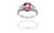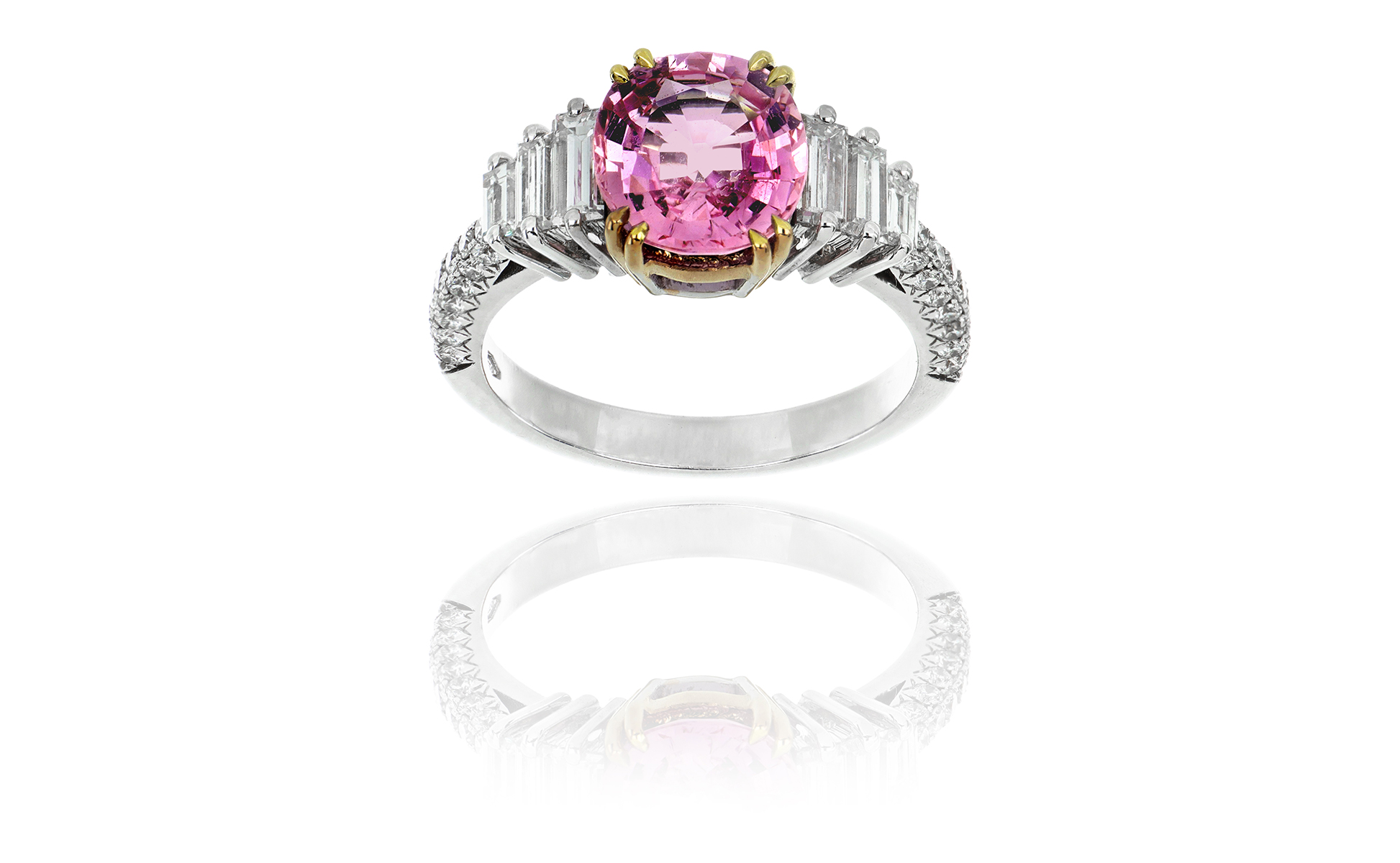 Anello in oro bianco con bellissimo zaffiro rosa di 3 03 ct accompagnato da report gemmologico IGN di Roma che ne attesta l'origine Birmana e l'assenza di trattamento termico completano l'anello diamanti di forma rotonda taglio a baguette per totali stimati 1 20 ct.