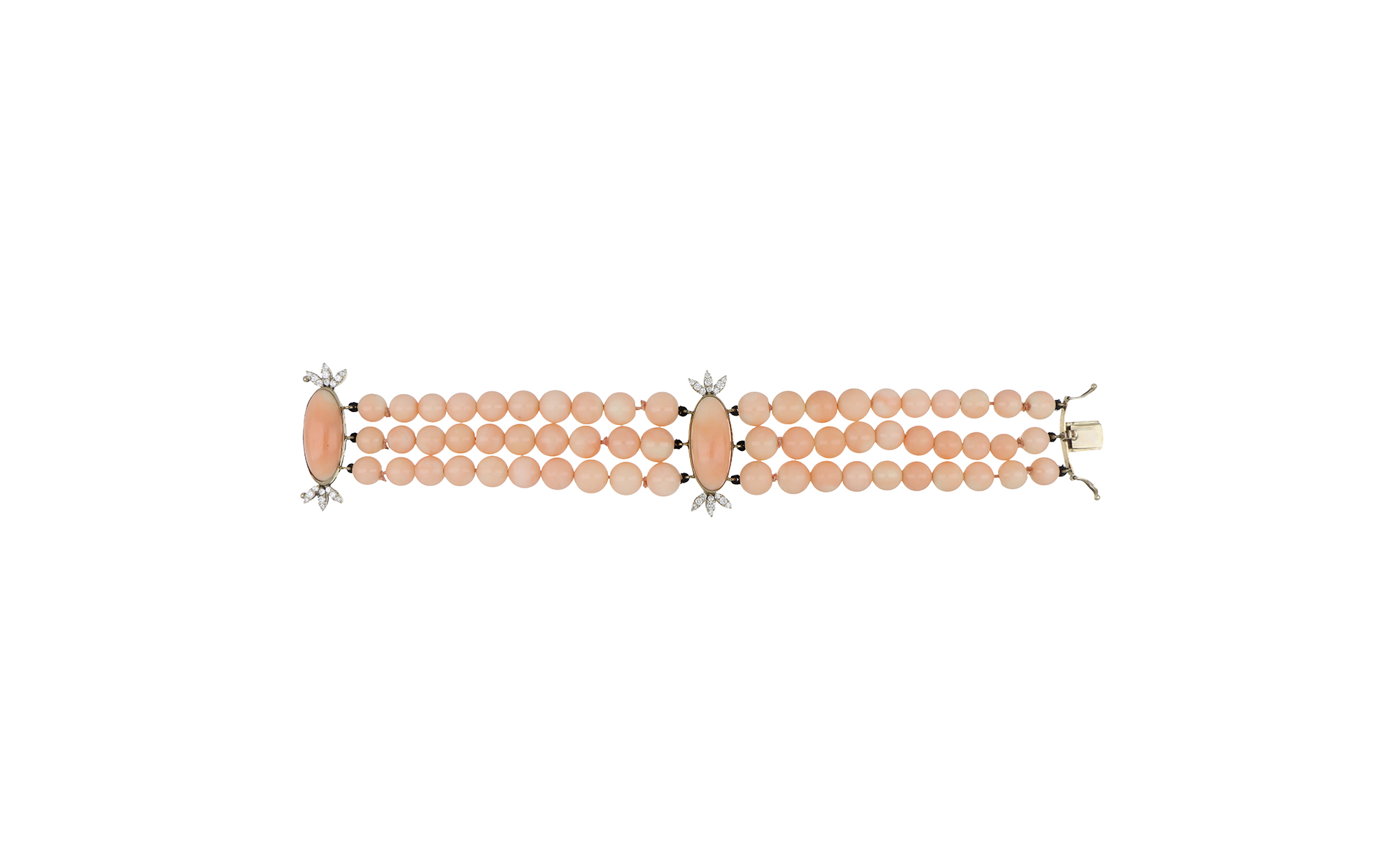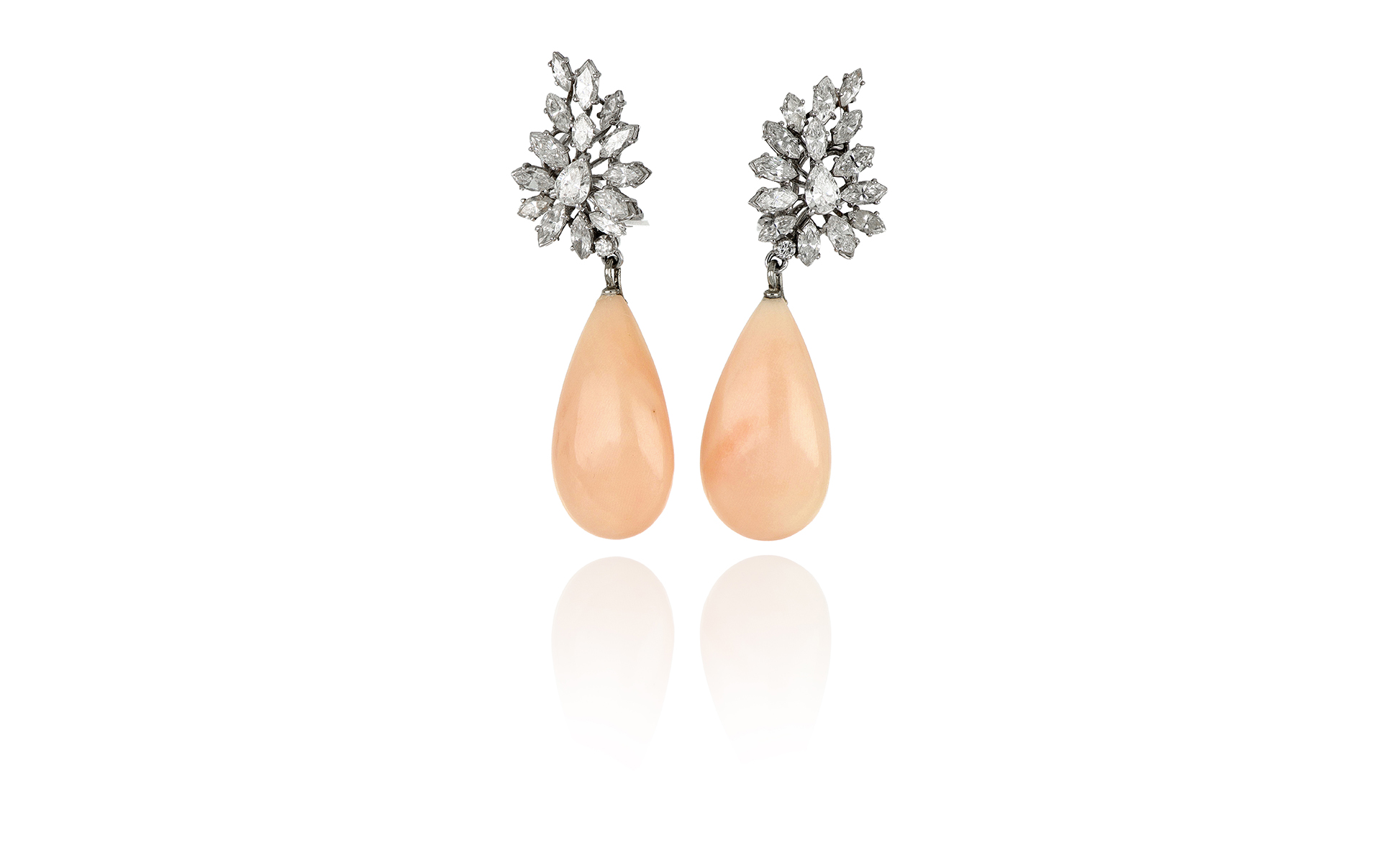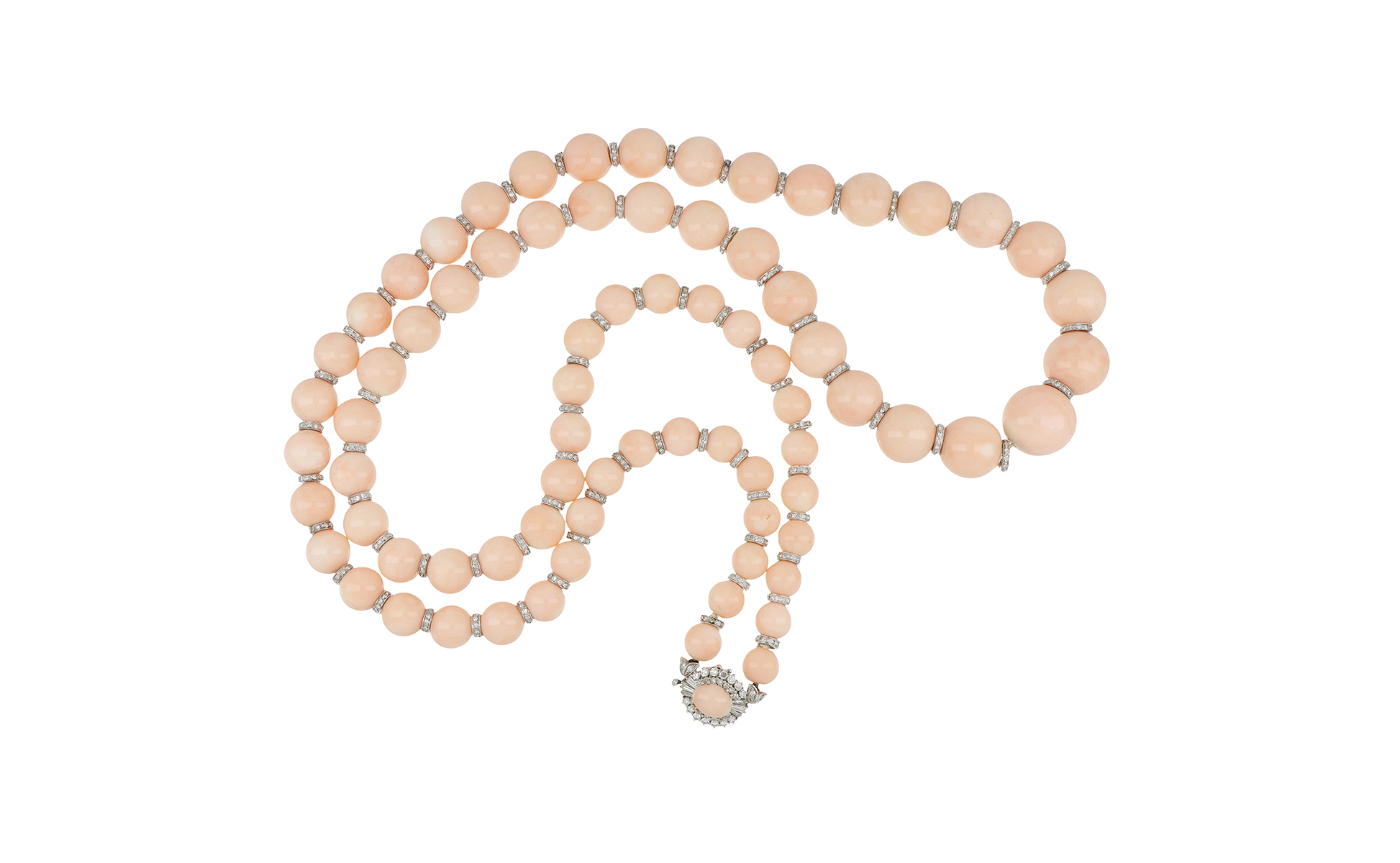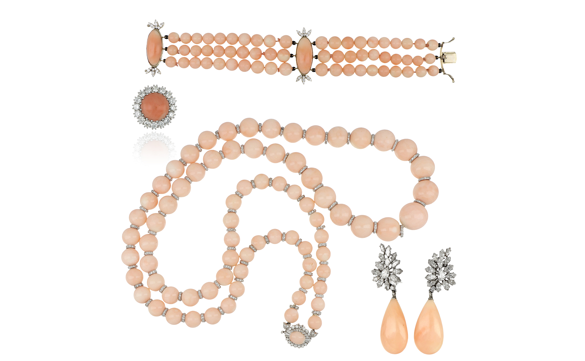 Elegante parure composta da bracciale orecchini lunga collana e anello in corallo rosa 'peau d'ange' il tutto montato in oro bianco e diamanti taglio brillante goccia e navette per complessivi ct. 12 0 ca.