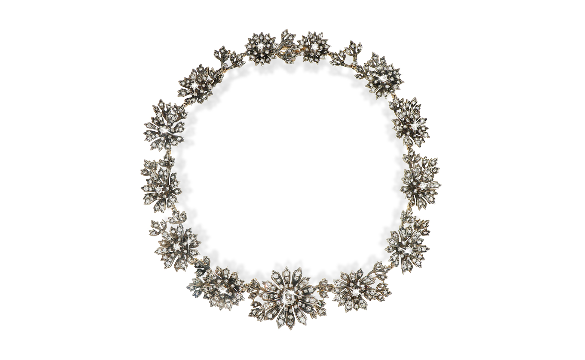 Girocollo scomponibile in argento e oro giallo di epoca fine 800 diamanti di taglio antico per ct. 5 00 ca. decorano il gioiello con fattura scomponibile.