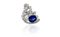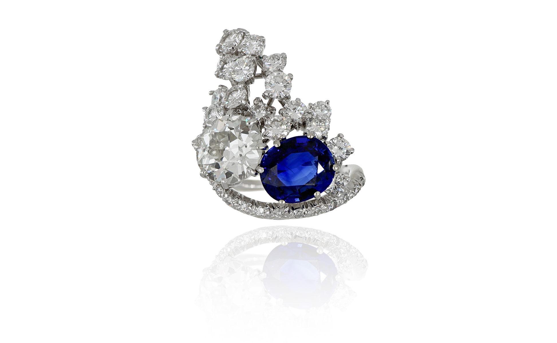 Al centro un contrariè di zaffiro taglio cuscino probabilmente non riscaldato di ct. 3 50 ca. e un diamante taglio vecchia europa di ct. 3 00 ca. colore J/L purezza VS/SI1 fluorescenza nulla 9 00 x 9 00 x 5 20 mm.