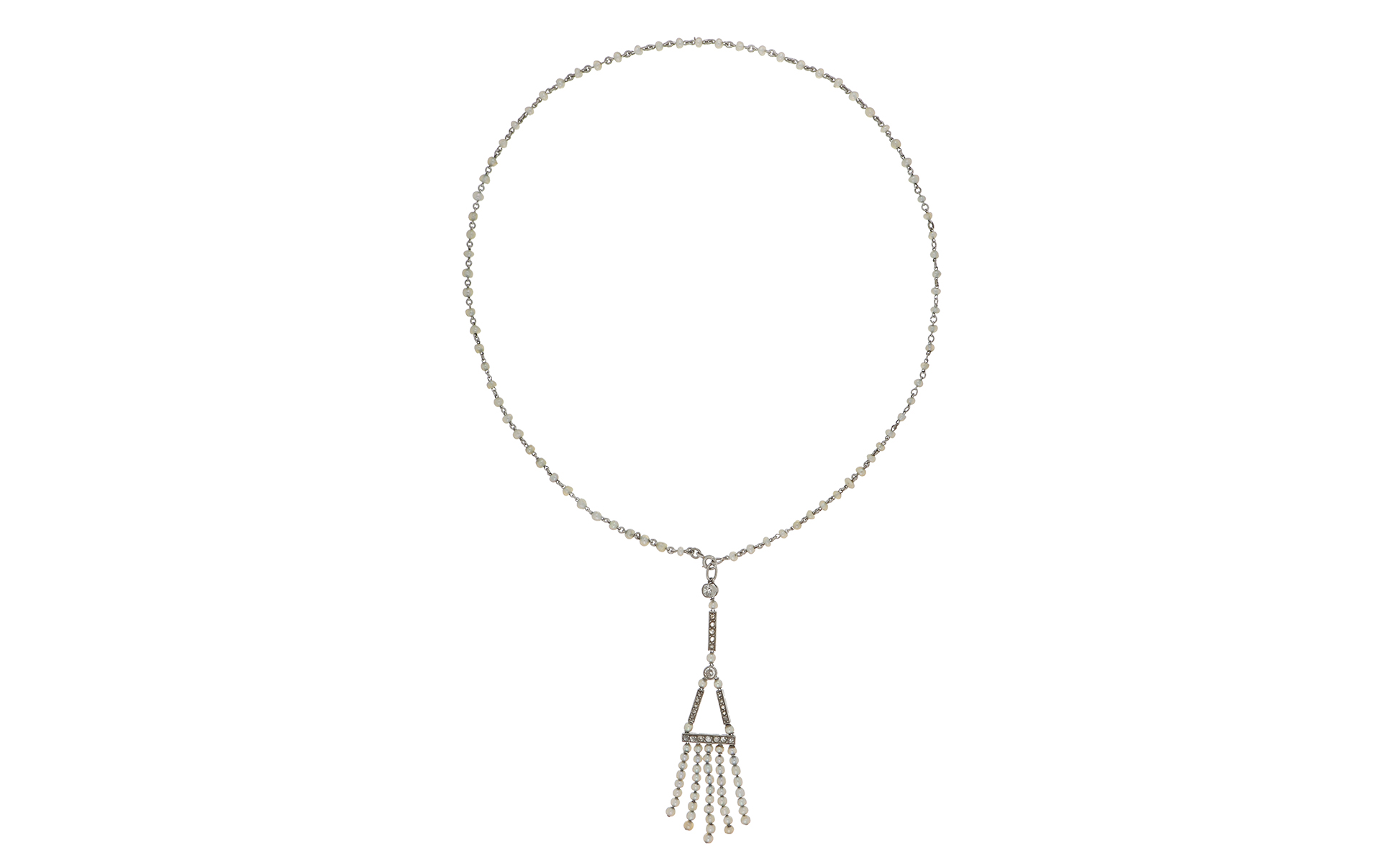 Elegante collanina con pendente in platino dei primi del 1900 con microperle e diamanti di taglio antico.