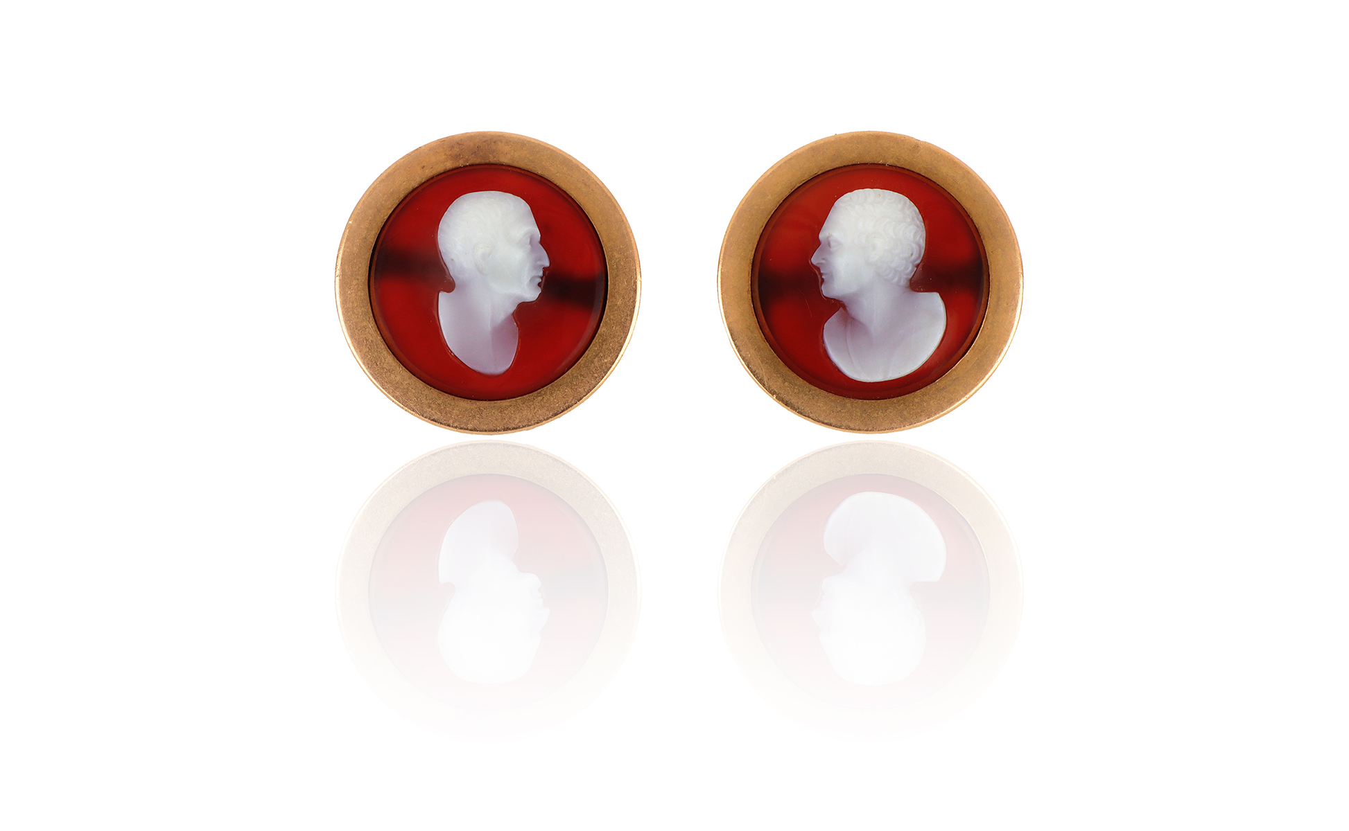 Bottoni in oro rosso di 2 cm di diametro con delicato cammeo su corniola raffigurante due busti romani.