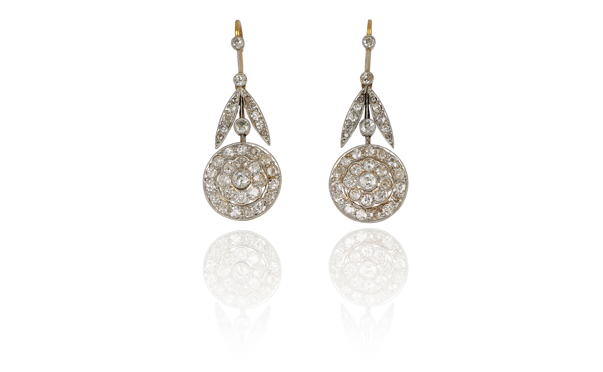Orecchini pendenti di primi '900 in oro giallo e platino con incastonati diamanti di taglio vecchio per stimati 1 2 ct. complessivi.