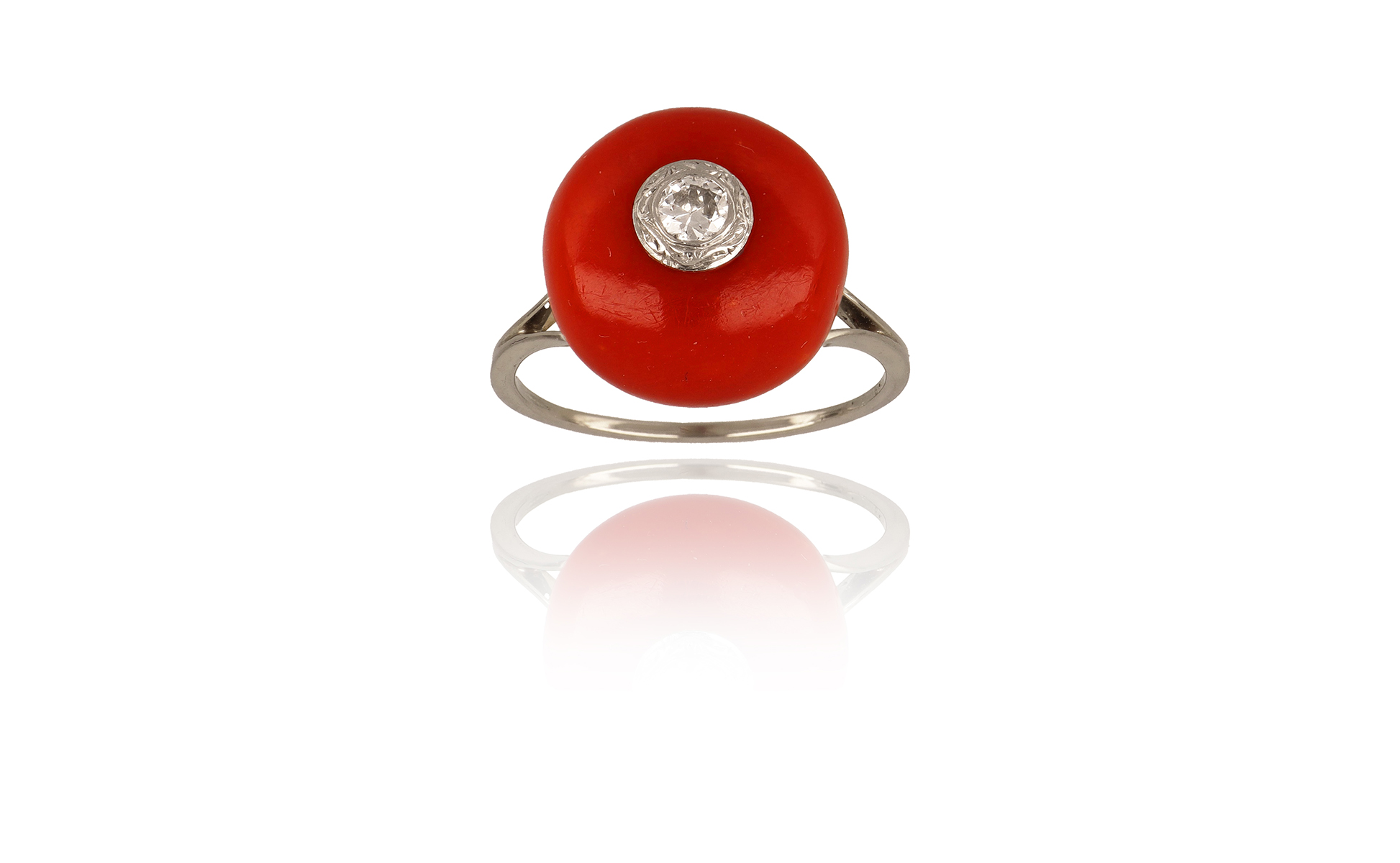 Anello in oro bianco con boule di corallo rosso e diamante incassato centrale di stimati 0 25 ct.