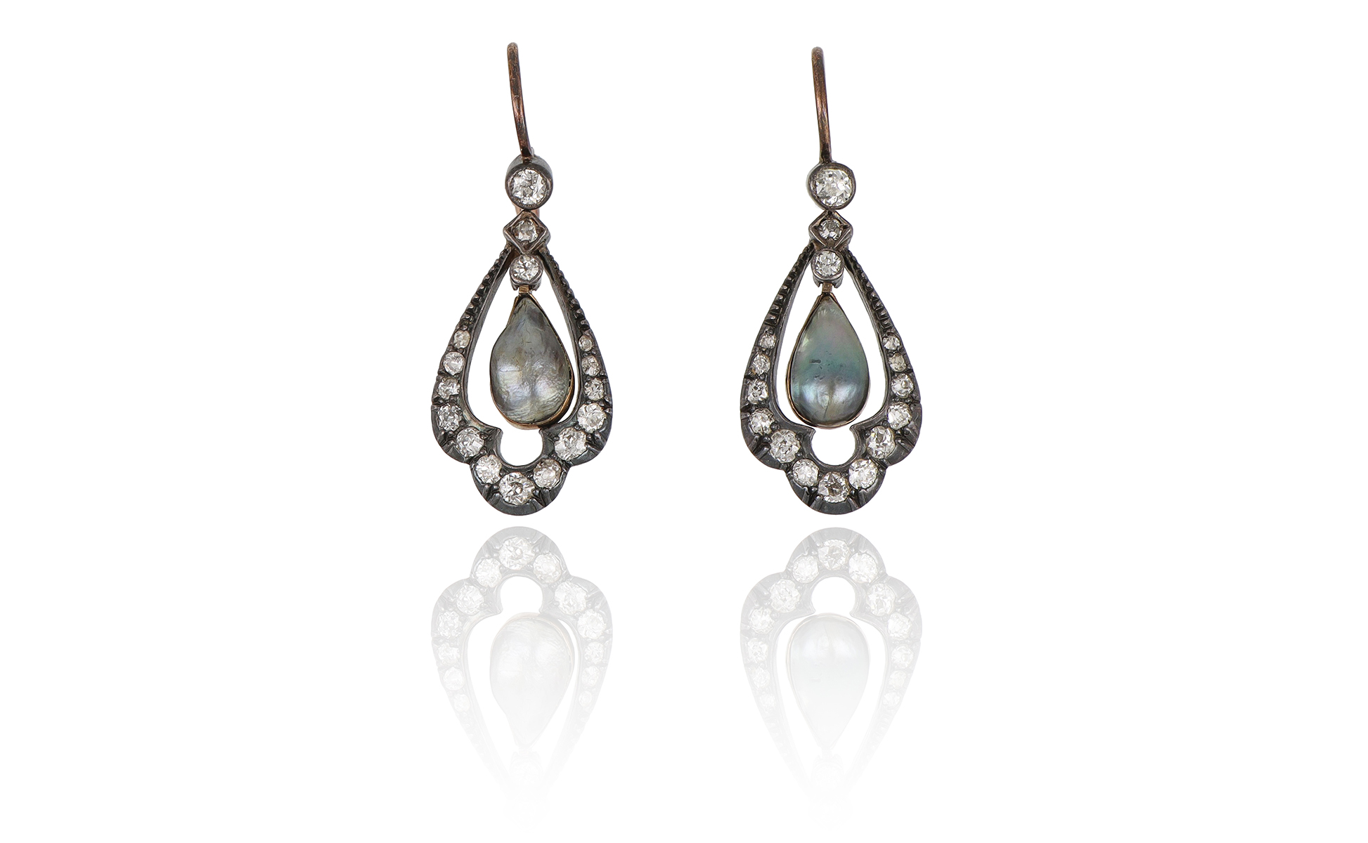 Orecchini pendenti in oro rosso e argento di epoca tardo vittoriana con diamanti a bordatura a scalare di taglio vecchio e due semi perle grigie a goccia.