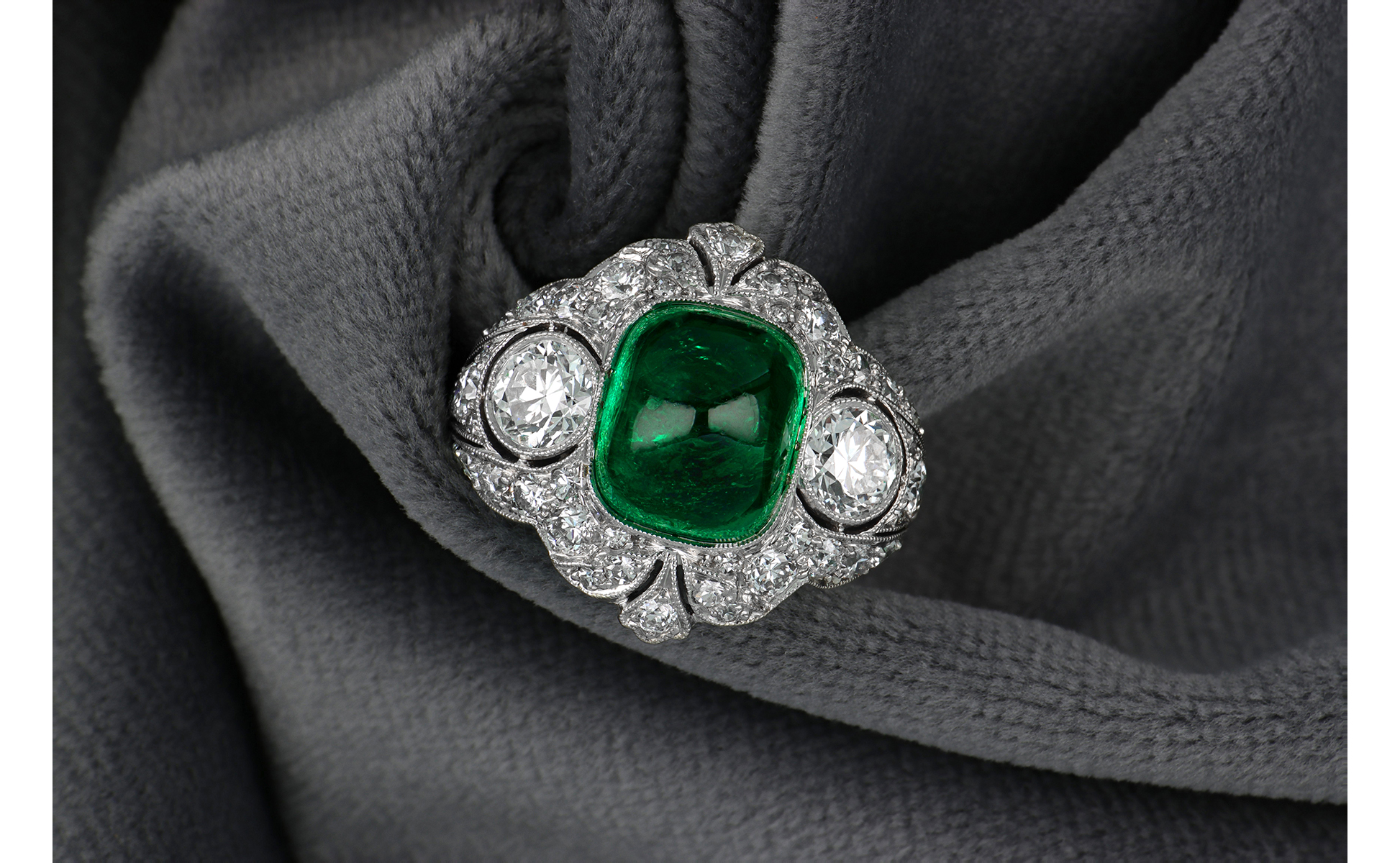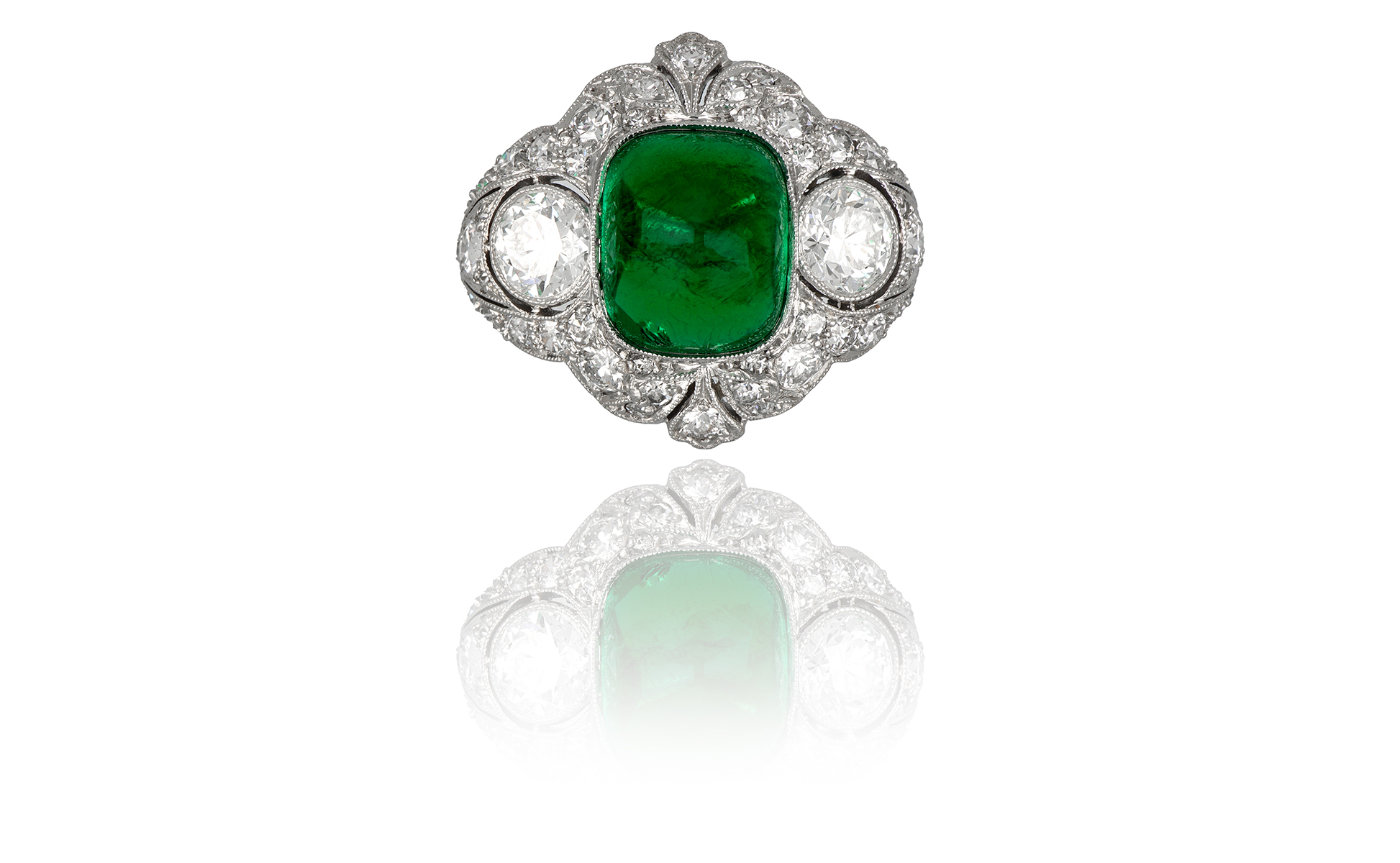 MARCUS - Anello di grande bellezza in platino anni '30 con smeraldo colombiano tagliato a cabochon di stimati 5 ct. Ottima trasparenza vivacità e saturazione del colore.