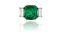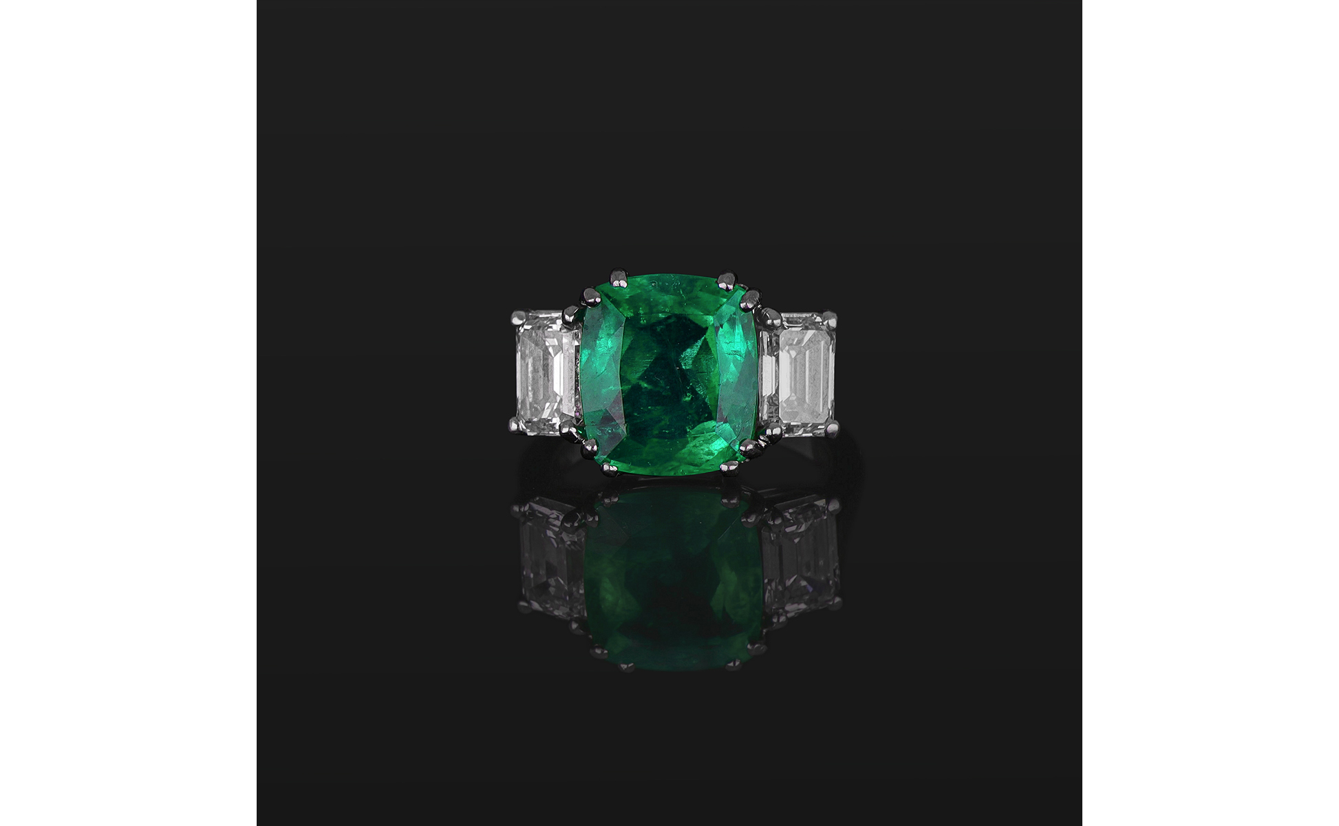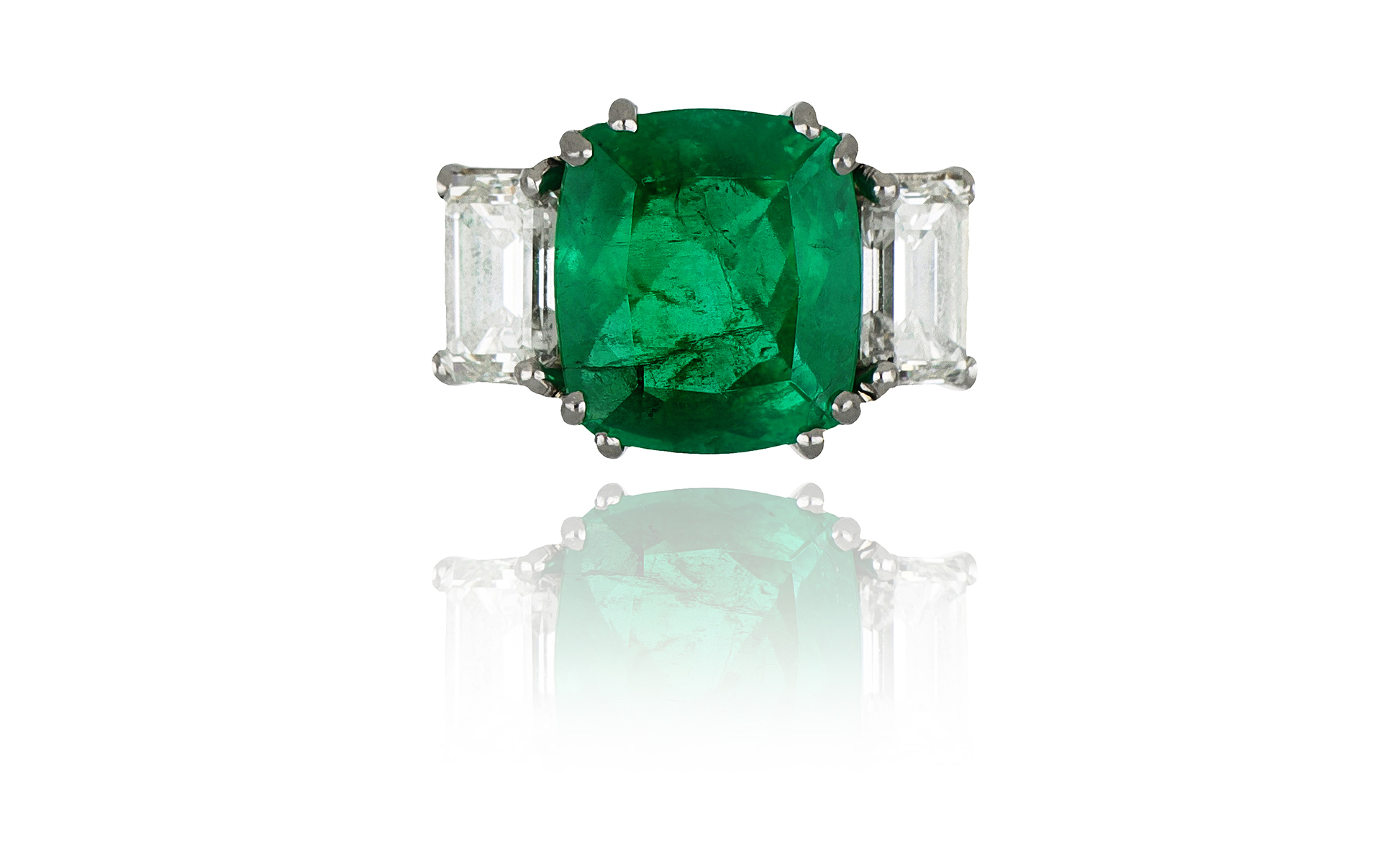 Importante anello a tre pietre in platino con smeraldo colombiano centrale di stimati ct 5 61 e due diamanti al fianco di forma rettangolare taglio a gradini rispettivamente di 1 24 e 1 18 entrambi di colore stimato G e purezza VVS.