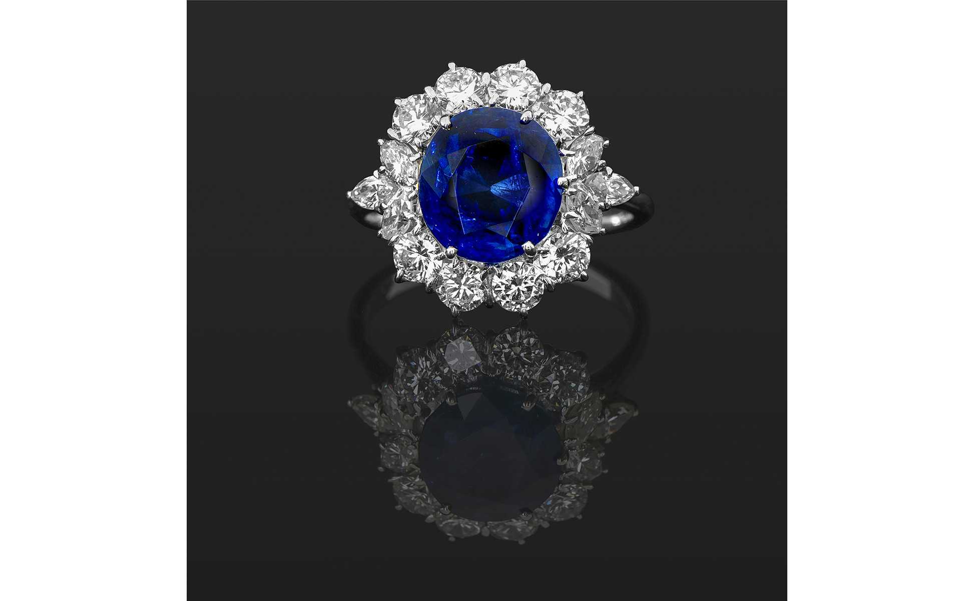 Anello in oro bianco con zaffiro centrale taglio a cuscino di 4 21 ct accompagnato da report gemmologico svizzero C.DUNAIGRE attestante l'origine birmana e l'assenza di trattamento termico. L'anello è contornato da 8 diamanti di forma rotonda taglio a brillante e 6 navette del peso complessivo di stimati 2 30 ct.