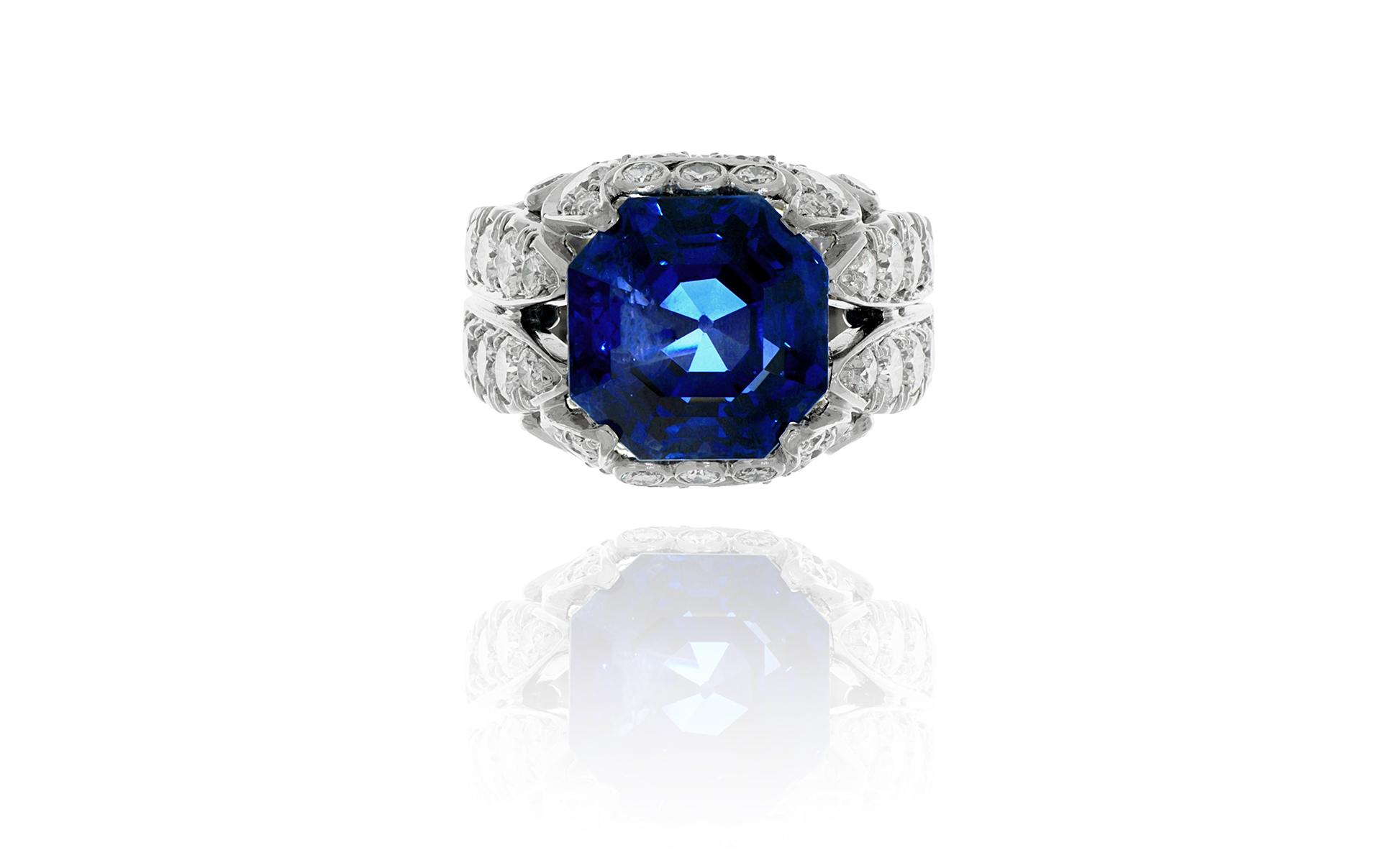 Anello in platino con importante zaffiro centrale di 9 83 ct taglio Asscher accompagnato da certificato gemmologico CISGEM che ne attesta l'origine Madagascar e l'assenza di trattamento termico. L'anello è tempestato di diamanti di forma rotonda taglio a brillante di stimati 3 50 ct.