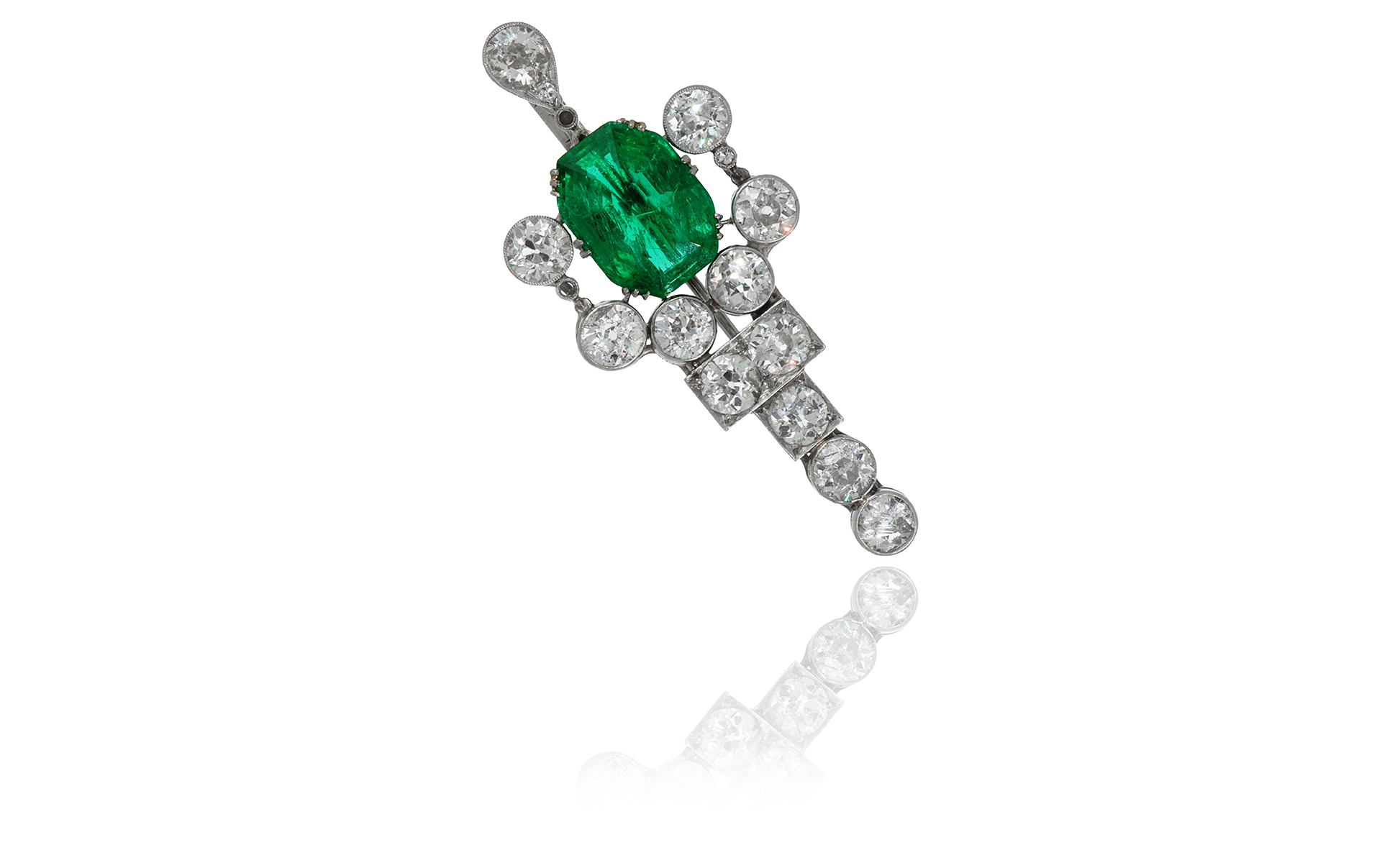Spilla in platino di forma geometrica 12 diamanti taglio antico per ct. 3 60 ca. fanno da contorno a uno smeraldo centrale colombiano taglio smeraldo ottagonale di ct. 6 76 misure: 14 0 x 10 5 mm.