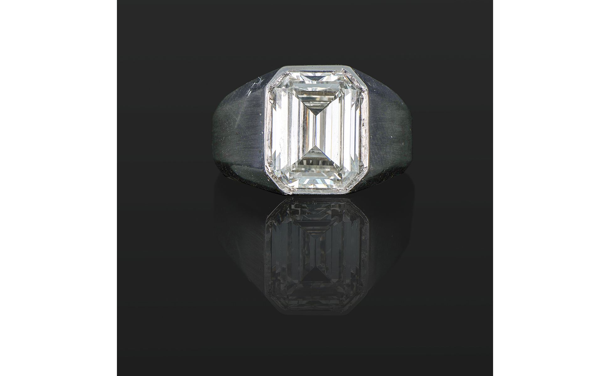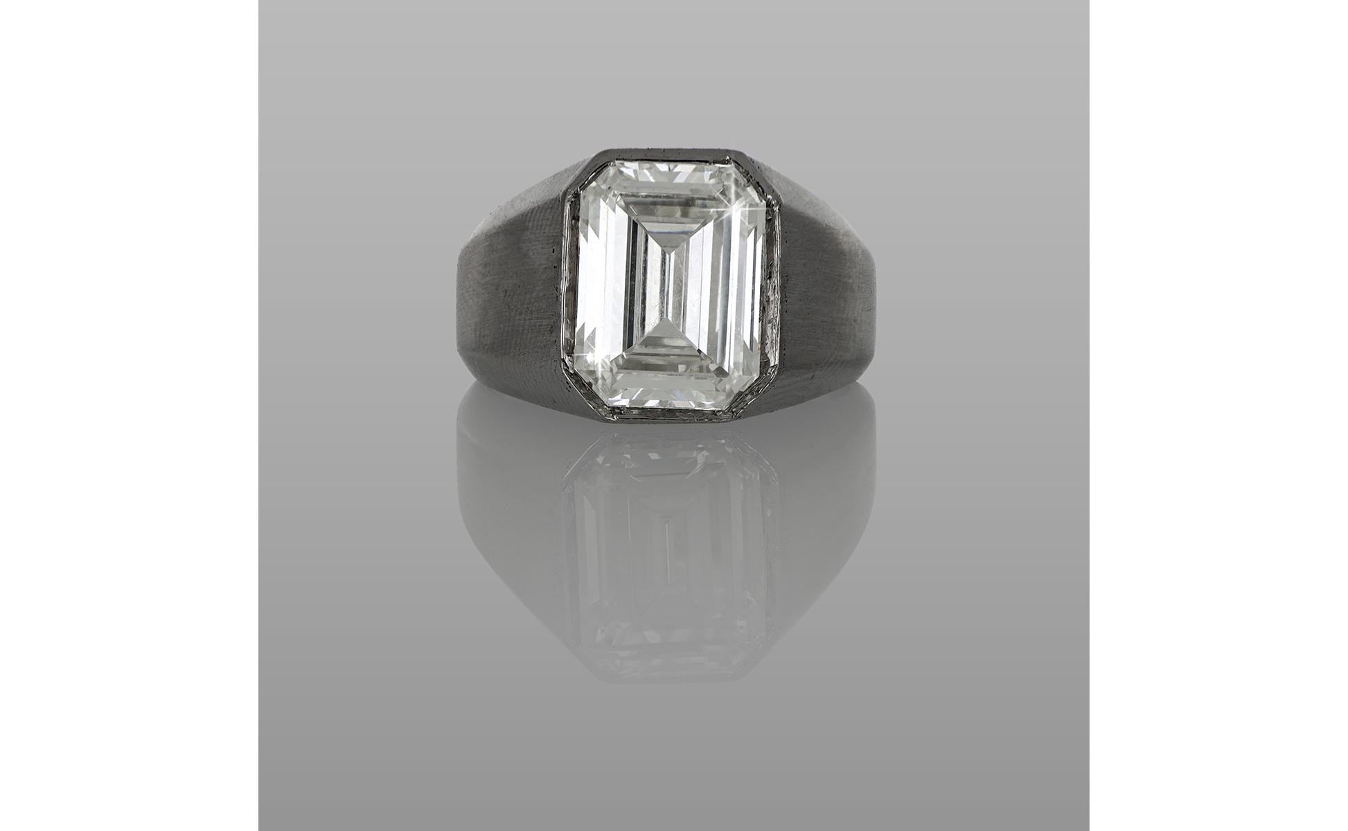 Anello a solitario fascetta sportiva in oro bianco satinato e lucido sui fianchi al centro un diamante taglio smeraldo di ct. 4 50 colore J purezza VVS 11 27 x 8 54 x 4 90 mm fluorescenza molto lieve.