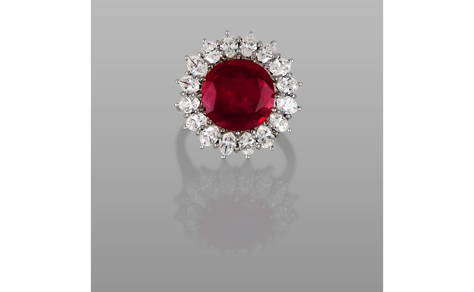 Fascinoso anello con rubino birmano la gemma di colore rosso porpora e taglio rotondo esibisce un ottima trasparenza e l'assenza di trattamenti termici ct. 6 70.