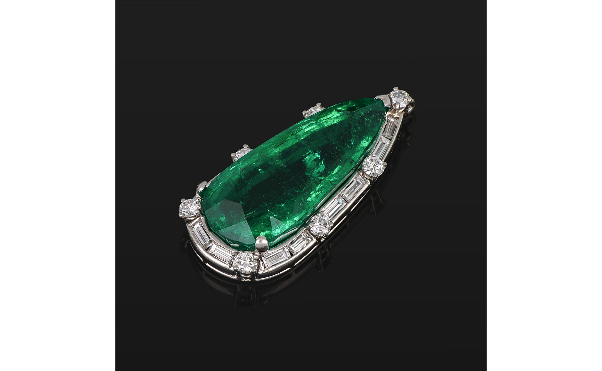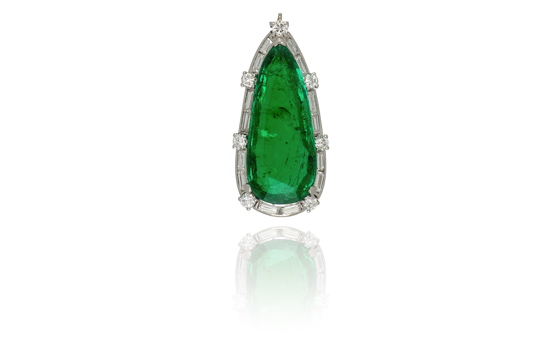 Importante pendente in platino composto da un raro smeraldo di 23 099 ct di forma a goccia allungata taglio misto (a brillante e step cut) accompagnato da certificato gemmologico svizzero SSEF che ne attesta l'origine colombiana 'green of medium to strong saturation' e la presenza di moderate oil. Il contorno in platino è composto da diamanti baguette intervallati da diamanti di forma rotonda per un totale stimato di 2 70 ct.