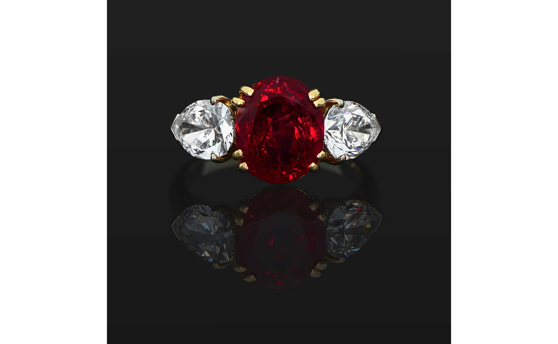 CUSI - Anello a tre pietre con importante rubino centrale di taglio a cuscino del peso di 4 586 ct accompagnato da report gemmologico svizzero SSEF attestante il colore red l'origine Birmana e l'assenza di trattamento termico.