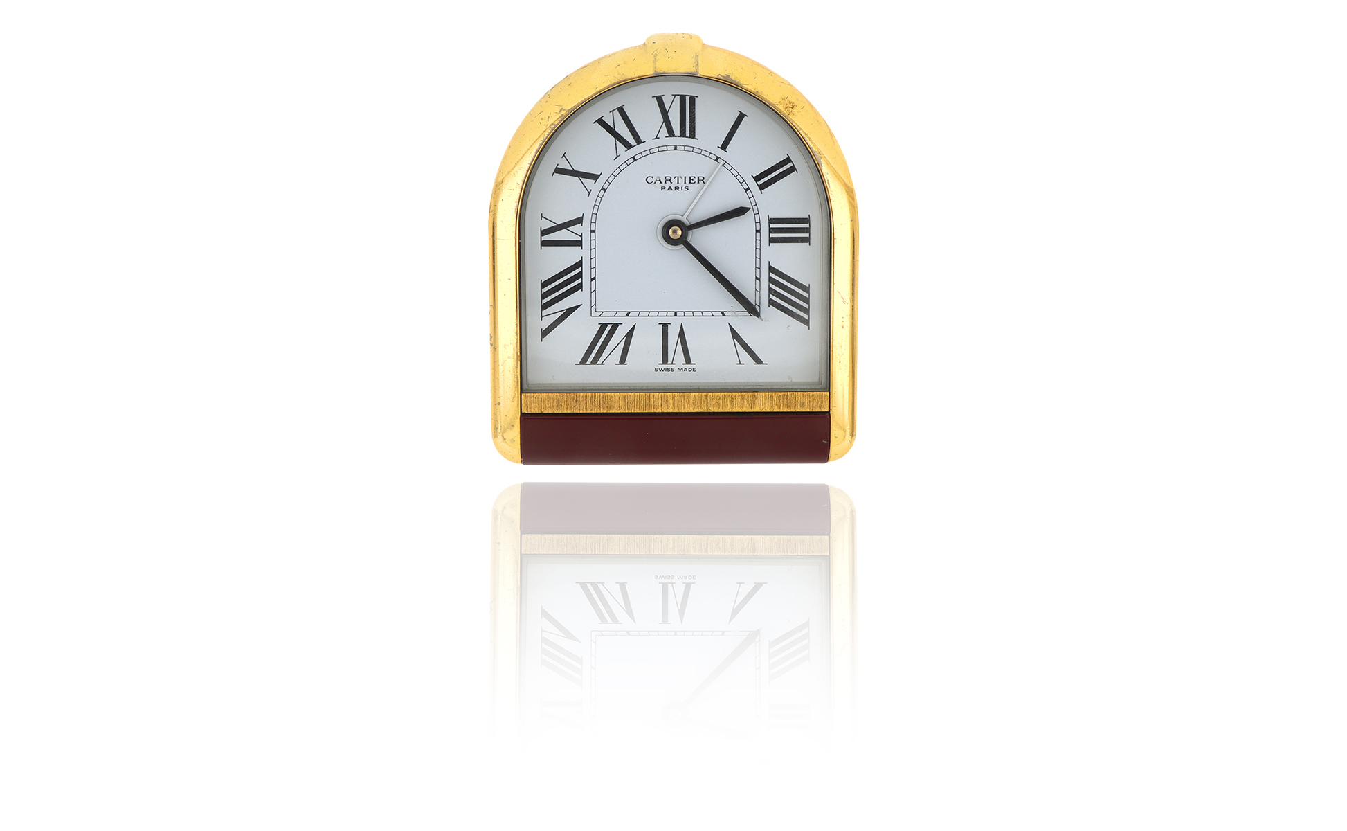 CARTIER - Orologio da tavolo con sveglia realizzato in metallo dorato e smaltato bordeaux nella parte in basso.