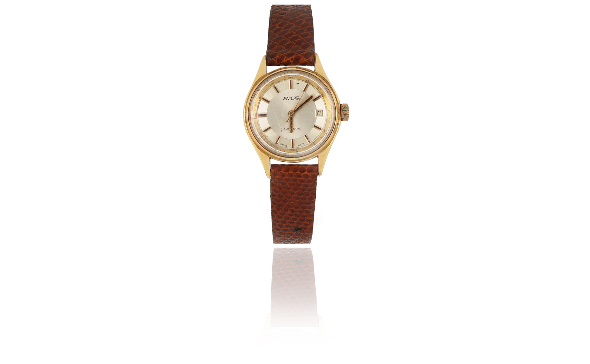 ENICAR - Orologio da donna con cassa in oro da 24 mm animato da movimento meccanico a carica automatica indici e sfere a bastone piccolo datario a ore 3 fondello a vite.