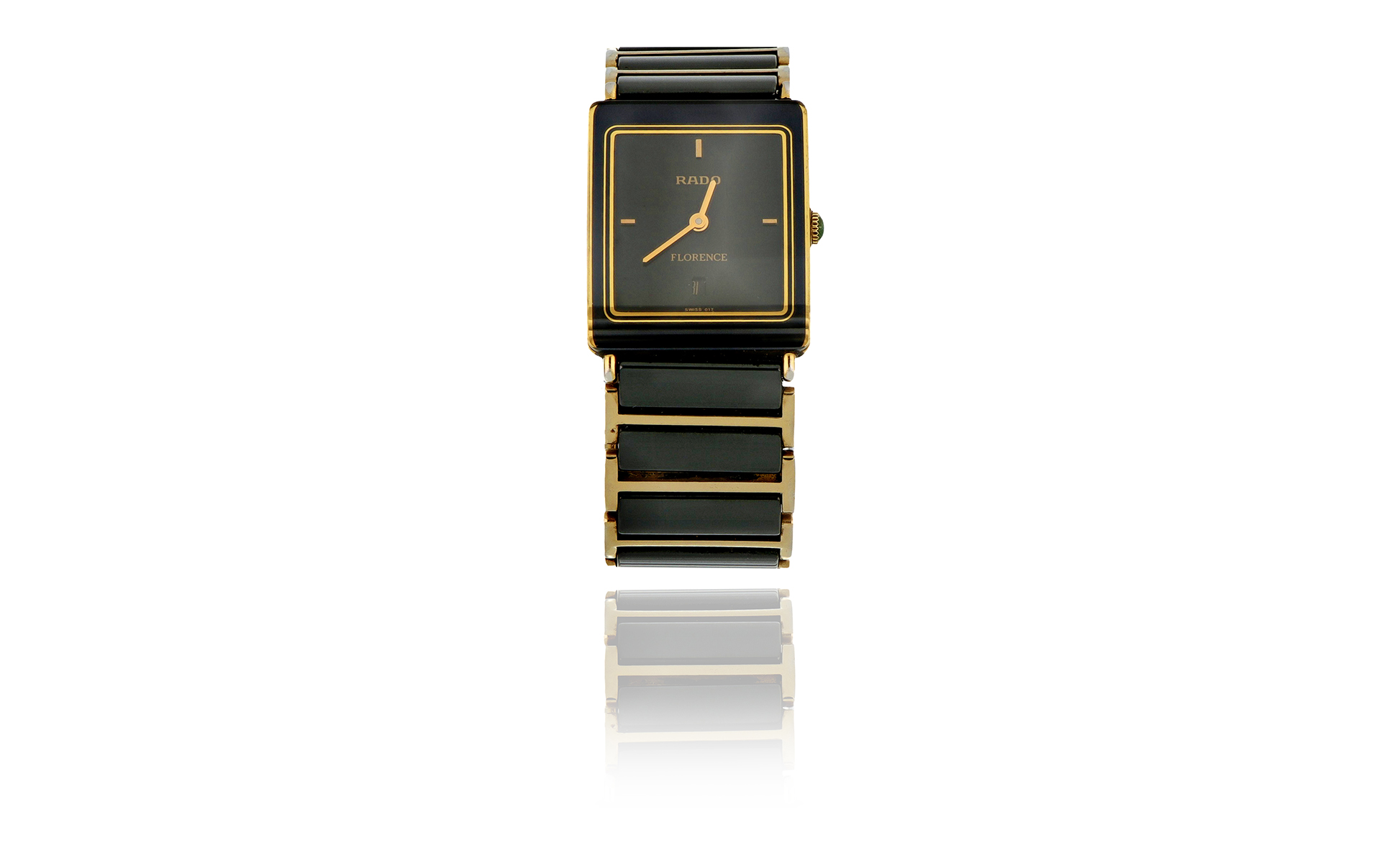 RADO - Orologio in ceramica nera e titanio modello florence la cassa di forma rettangolare racchiude un movimento al quarzo e integra un bracciale a settori ceramici il quadrante nero riprende gli stilemi della cassa con i soli indici ai punti cardinali.