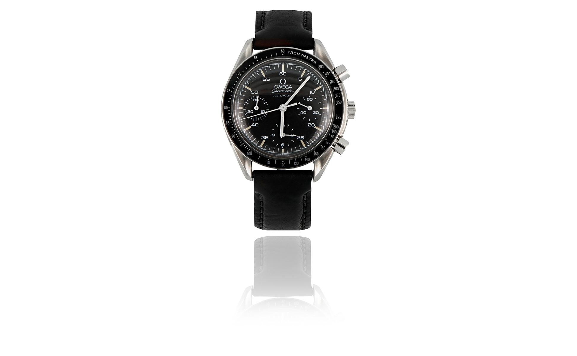 OMEGA - Orologio da uomo in acciaio modello speedmaster animato da movimento meccanico a carica automatica con funzione di cronometro quadrante nero matte scala tachimetrica sulla lunetta nera anse ad elica.