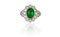 Anello in oro bianco e giallo a foggia di fiore al centro smeraldo ovale cabochon per ct. 3 00 ca. contornato da 12 diamanti taglio brillante piu' 6 sul gambo per complessivi ct. 1 50 ca.