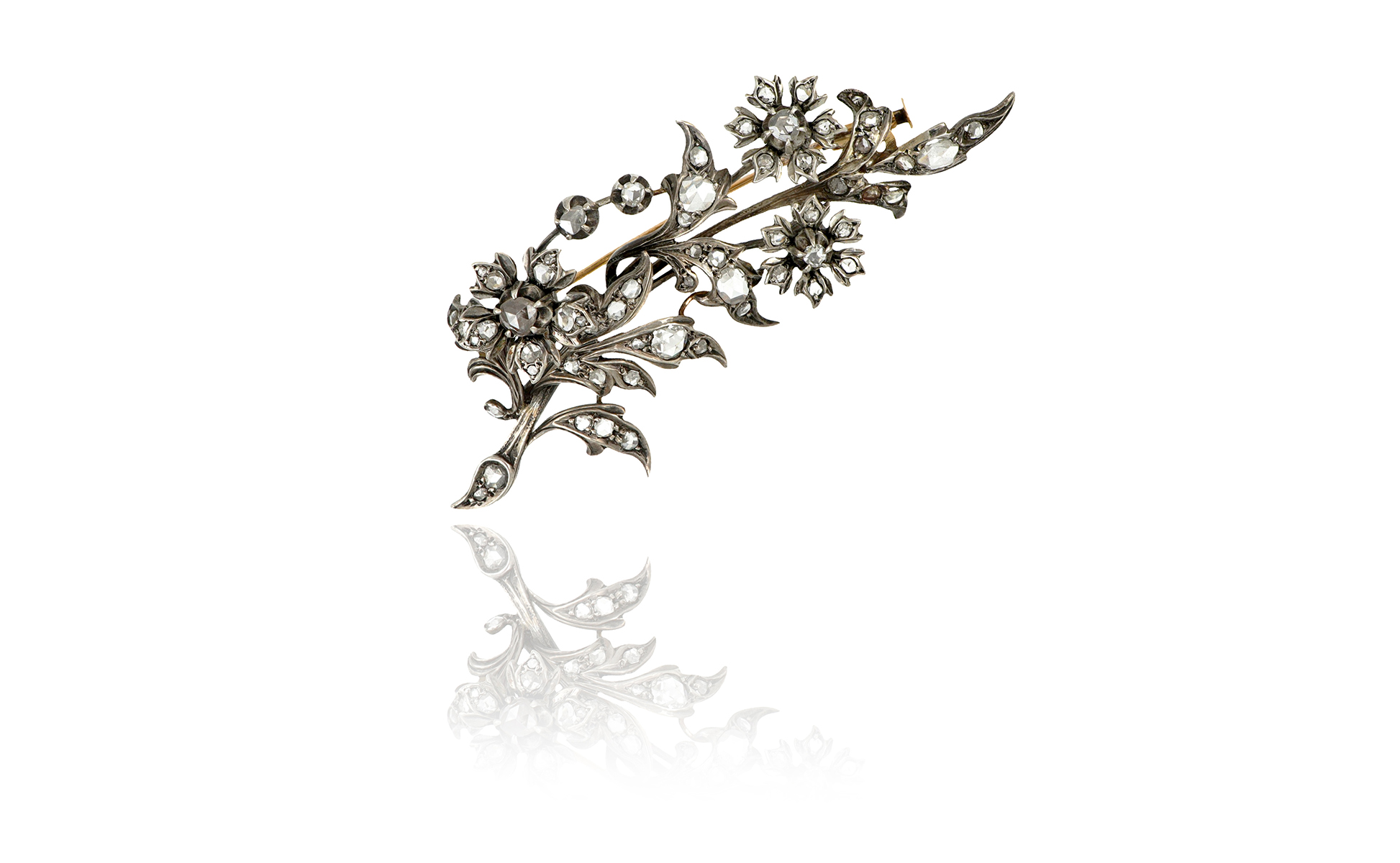 Spilla di antica manifattura in oro e argento a forma di tralcio fiorito è adornata con diamanti taglio rosa.