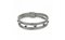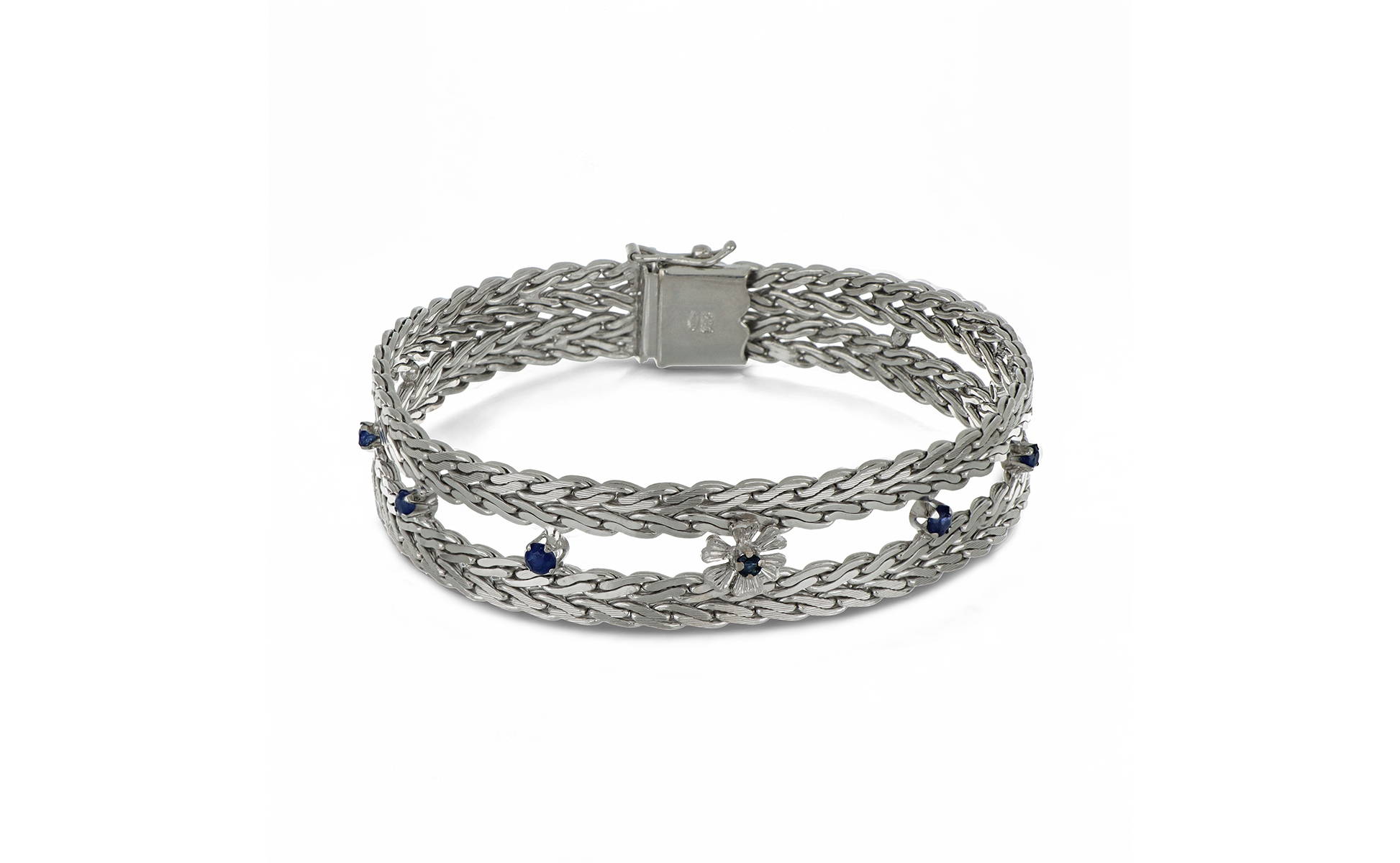 Bracciale in oro bianco a maglia semirigida piatta e satinata si allarga al centro dove ha 7 piccoli zaffiri a decoro intercalati da spazi vuoti.