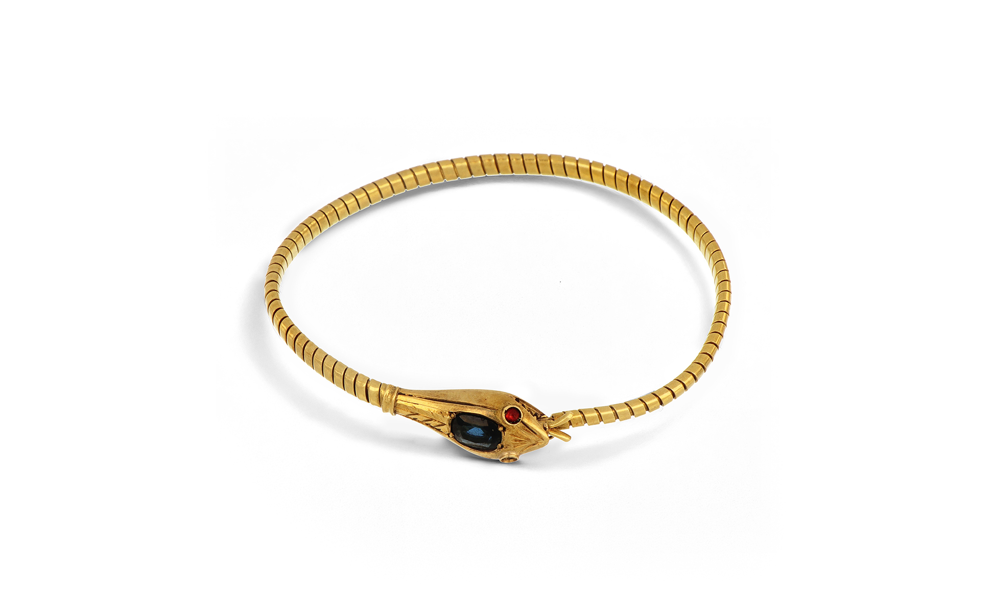 Bracciale a serpente in oro giallo realizzato con la tecnica del tubo-gas la struttura elastica è decorata sulla testa con vetri blu e rossi.