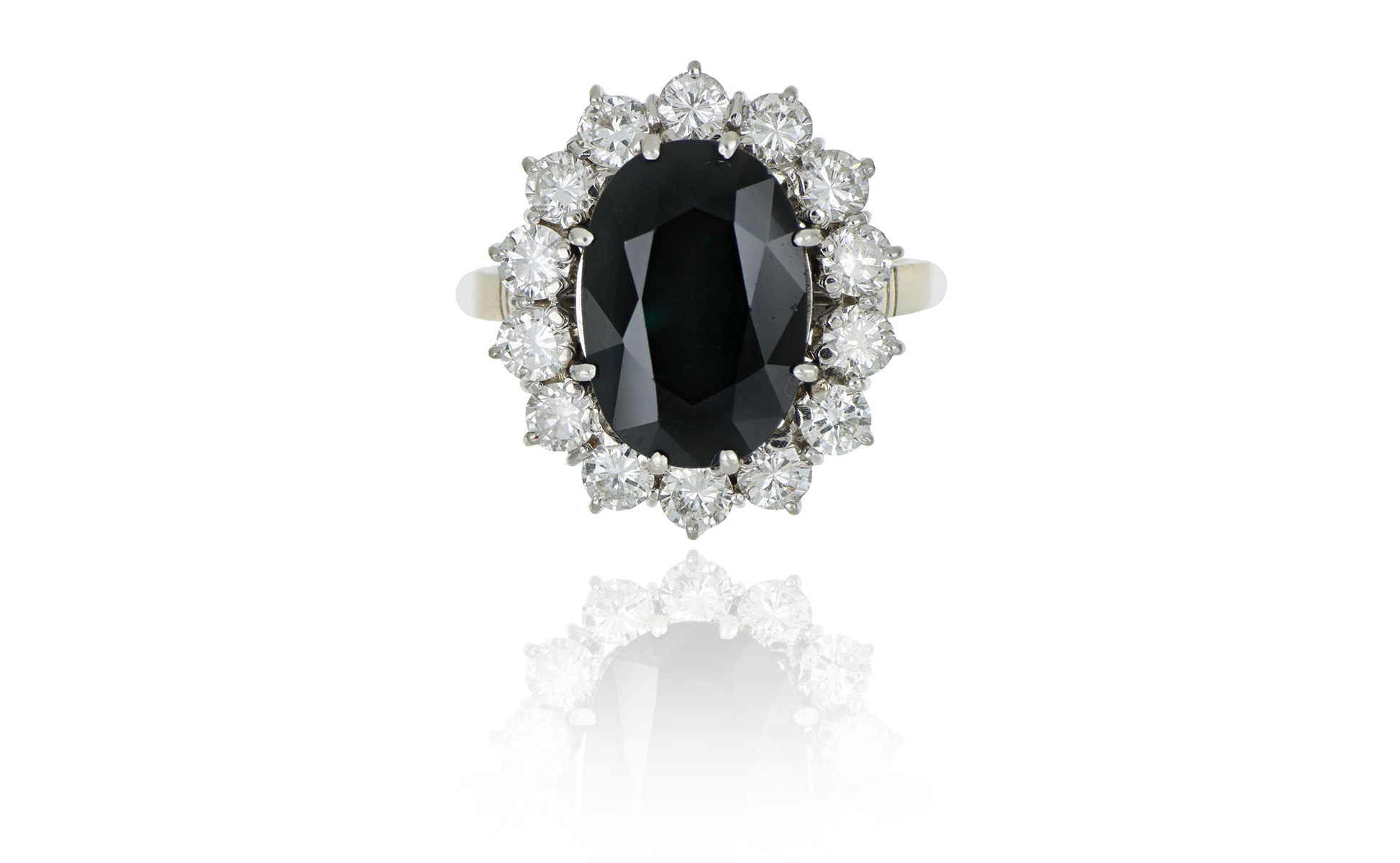 Anello in oro bianco a margherita grande zaffiro centrale di ct. 6 00 ca. contornato da 14 diamanti taglio brillante per ct. 1 40 ca.